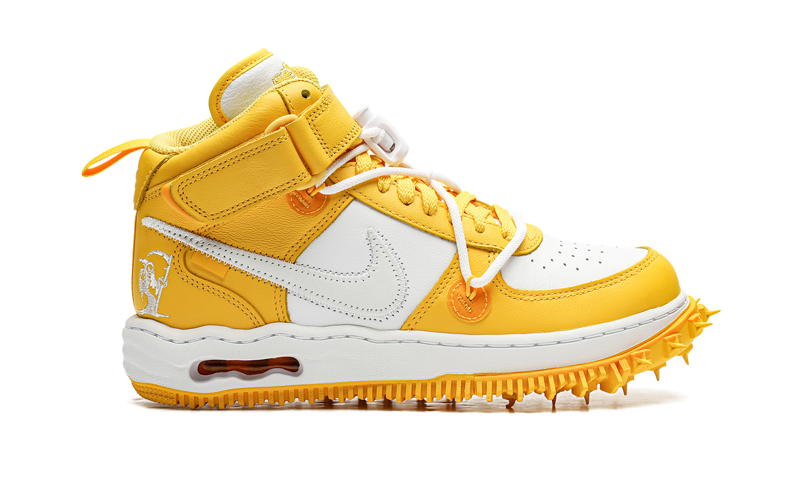 The Off-White x Nike Air Force 1 Mid “Varsity Maize” is a collaboration between the high fashion and streetwear brand and Nike on a contemporary-looking version of the retro mid-top shoe. The Air Force 1 Mid by the late Virgil Abloh’s Off-White clothing brand succeeds its previous Air Force 1 Low projects that were released from 2017 through 2022. The “Varsity Maize” features a white leather upper with Varsity Maize-colored leather overlay panels and leather Swoosh branding. A Varsity Maize leather ankle strap appears on the collar. Off-White’s signature dual lacing system gives the design a futuristic appearance. Off-White’s industrial-style branding is printed on the medial side of the shoe. A grim reaper motif is embroidered in white on the lateral side of the heel. A wavy midsole and a spiked outsole complete the look. Release date: November 9, 2023