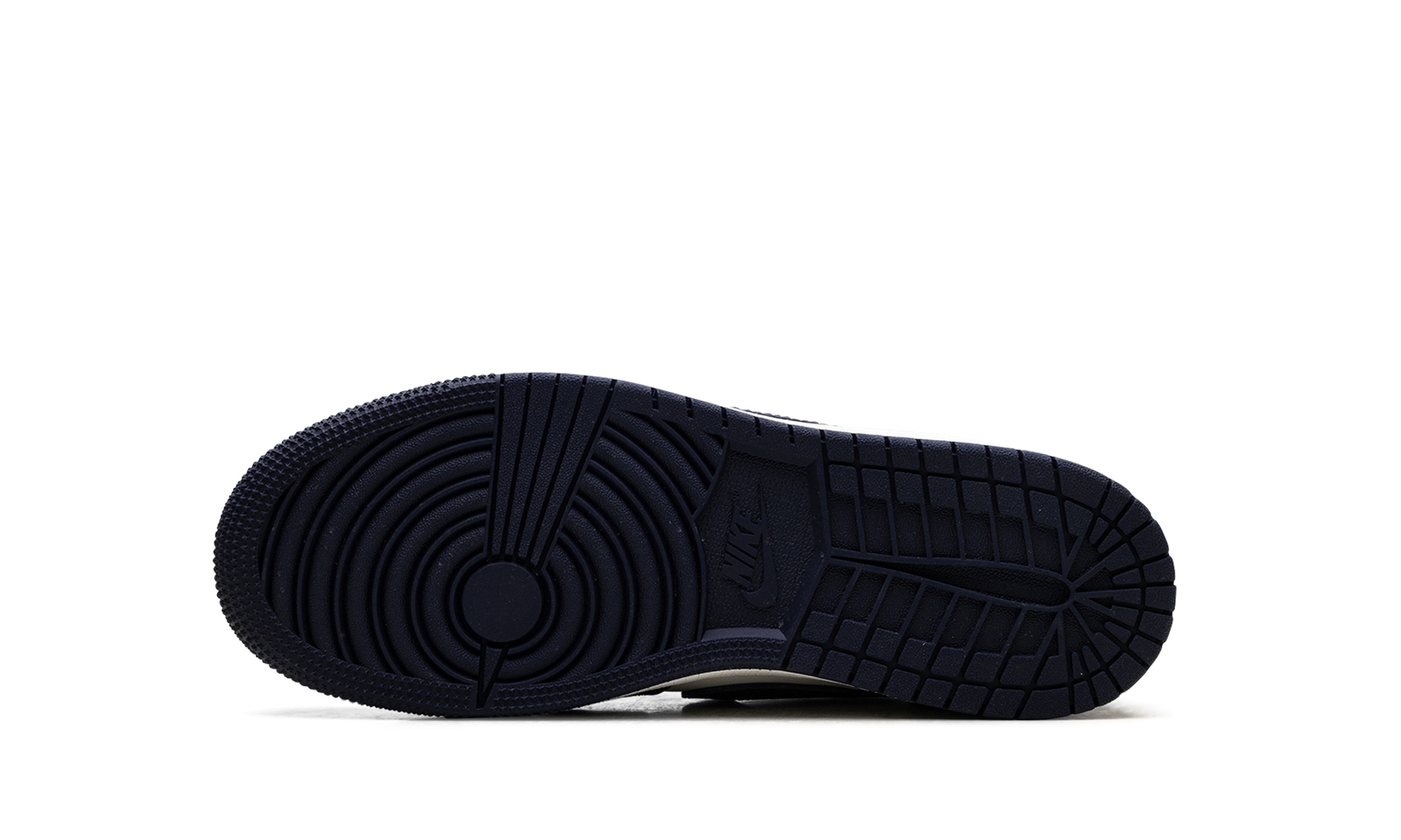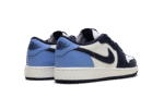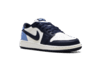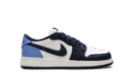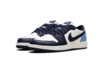 The Air Jordan 1 Low GS “Obisidian” is the grade school version of the 2025 lowtop. The kids’ AJ1 Low OG “Obisidian” has a leather upper that combines shades of navy and light blue with off-white. The lowtop Jordan 1 has a Wings logo on the heel and a navy Swoosh.