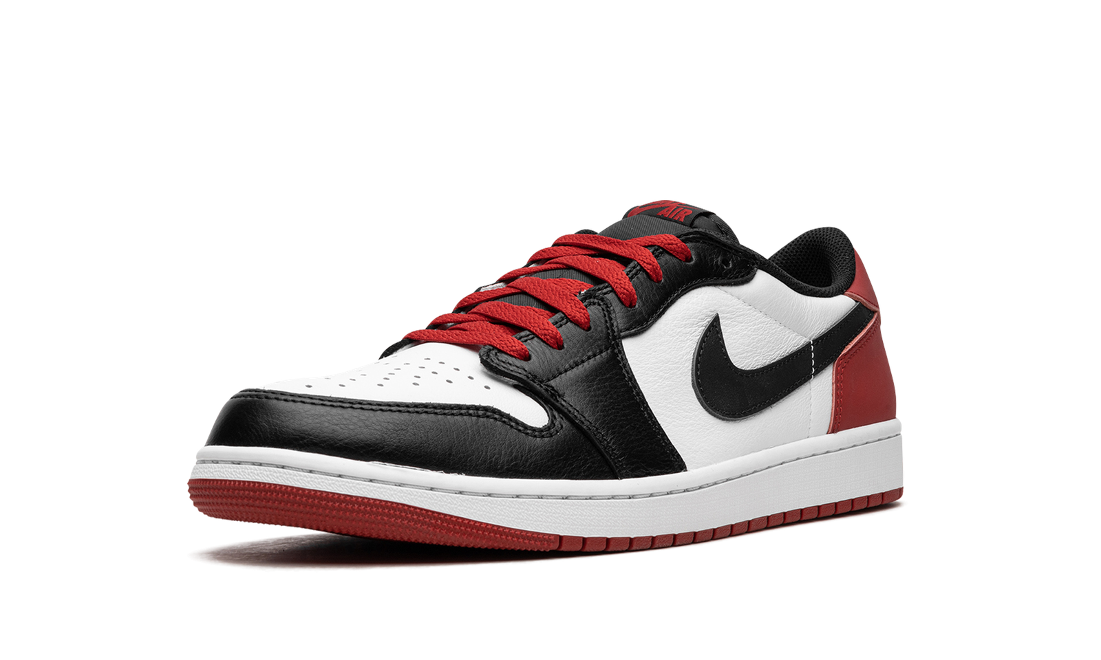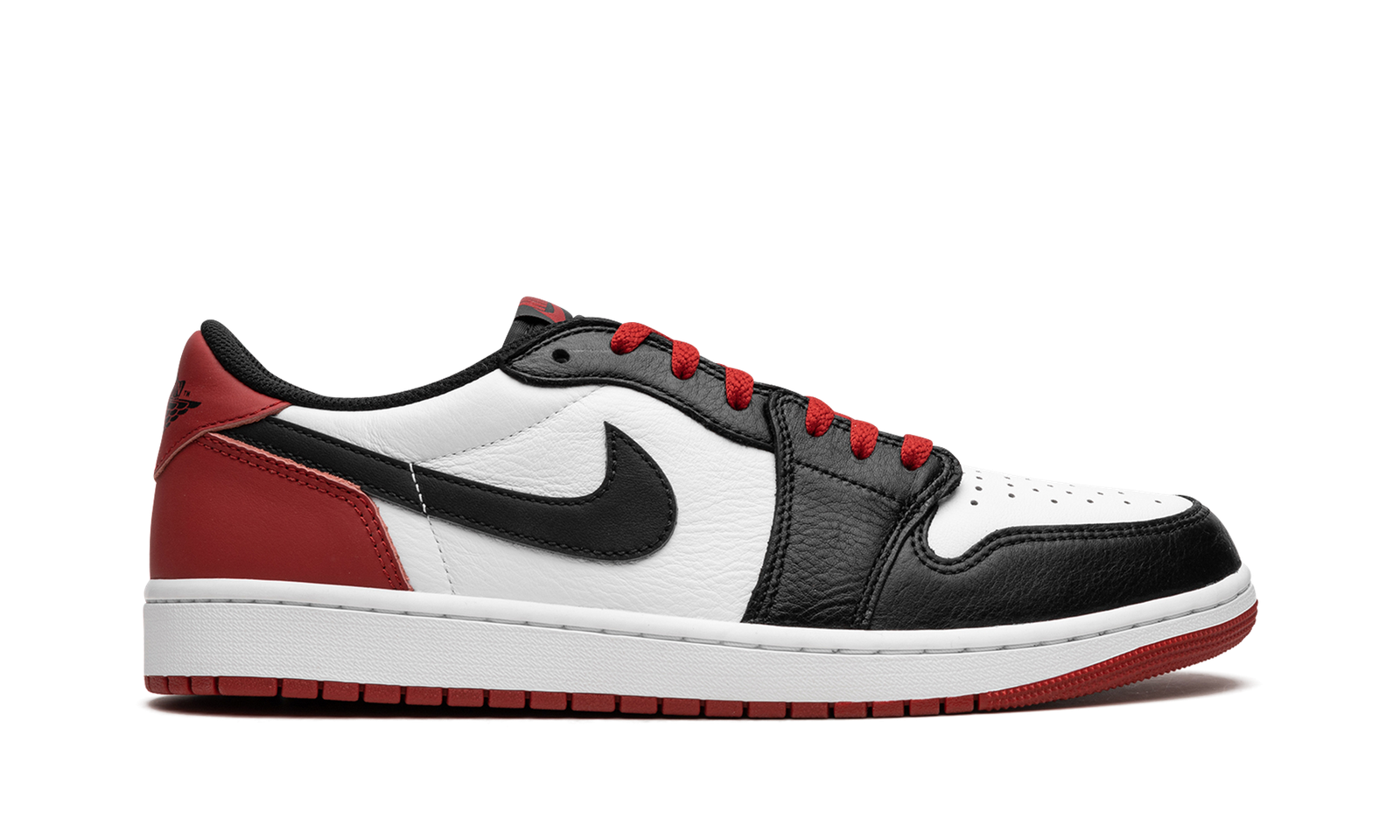 The Air Jordan 1 Low OG “Black Toe” is a colorway of the classic low-top retro basketball shoe that shows love to one of the model’s original styles. The “Black Toe” was an original colorway of the Air Jordan 1 High in 1985, and was worn by Michael Jordan with the Chicago Bulls during his rookie season in the NBA. Here, the colorway is transferred onto the Jordan 1 Low OG. The shoe features a white leather base with black leather overlays on the toe cap, forefoot, and eyelets. A black leather Swoosh logo appears on the sides. Varsity Red leather can be found on the heel, as can a black “Wings” logo on the heel tab. Classic “Nike” and Swoosh branding appear on the tongue tag. A white rubber midsole and black rubber outsole complete the look. Release date: July 28, 2023