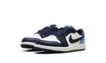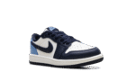 The Air Jordan 1 Low PS “Obisidian” is the preschool version of the 2025 lowtop. The little kids’ AJ1 Low OG “Obisidian” has a leather upper that combines shades of navy and light blue with off-white. The lowtop Jordan 1 has a Wings logo on the heel and a navy Swoosh.