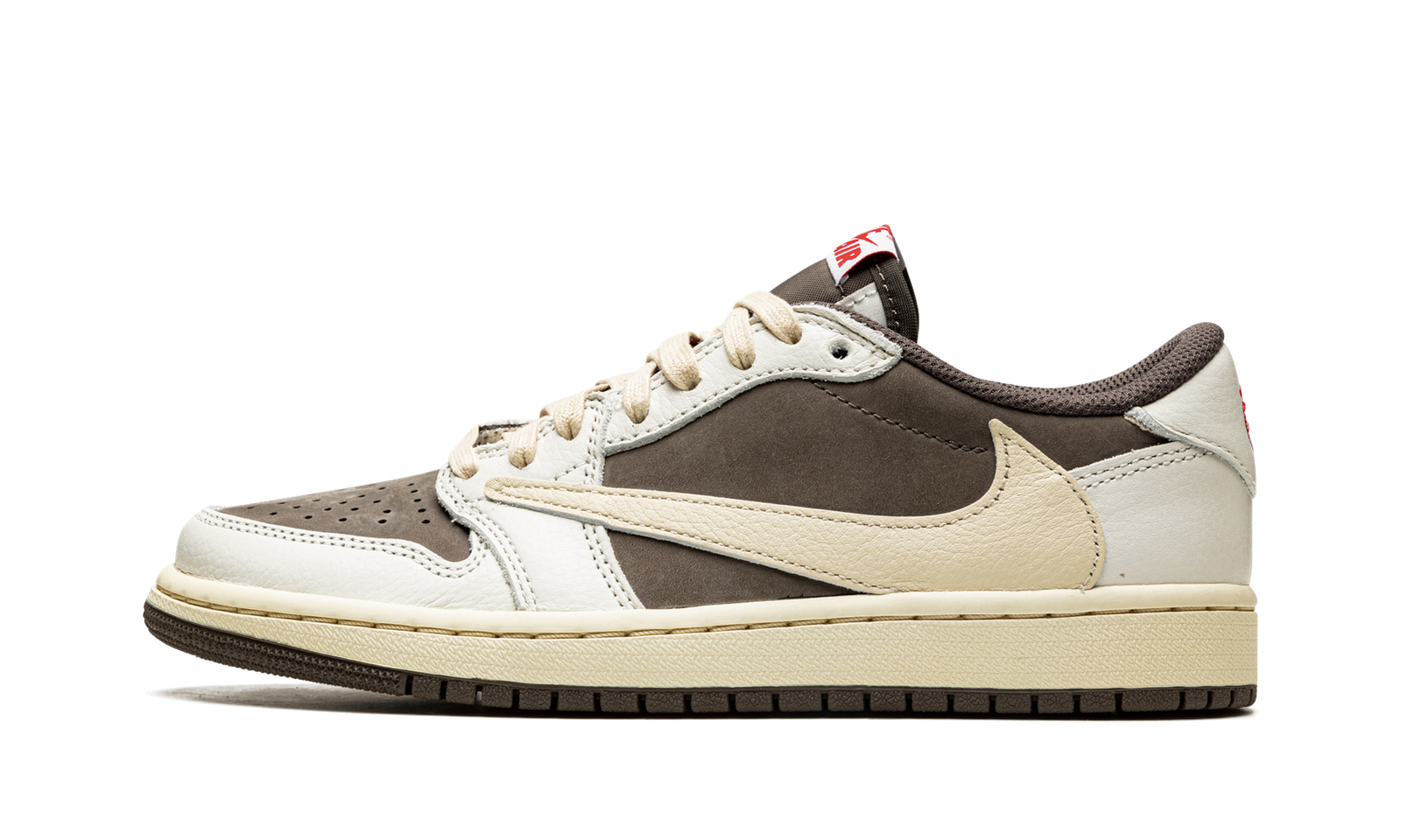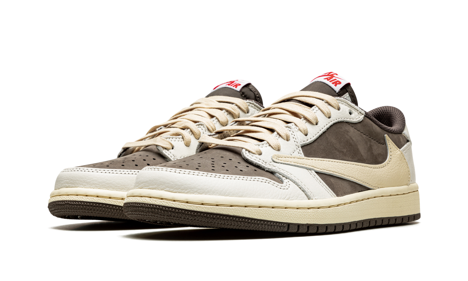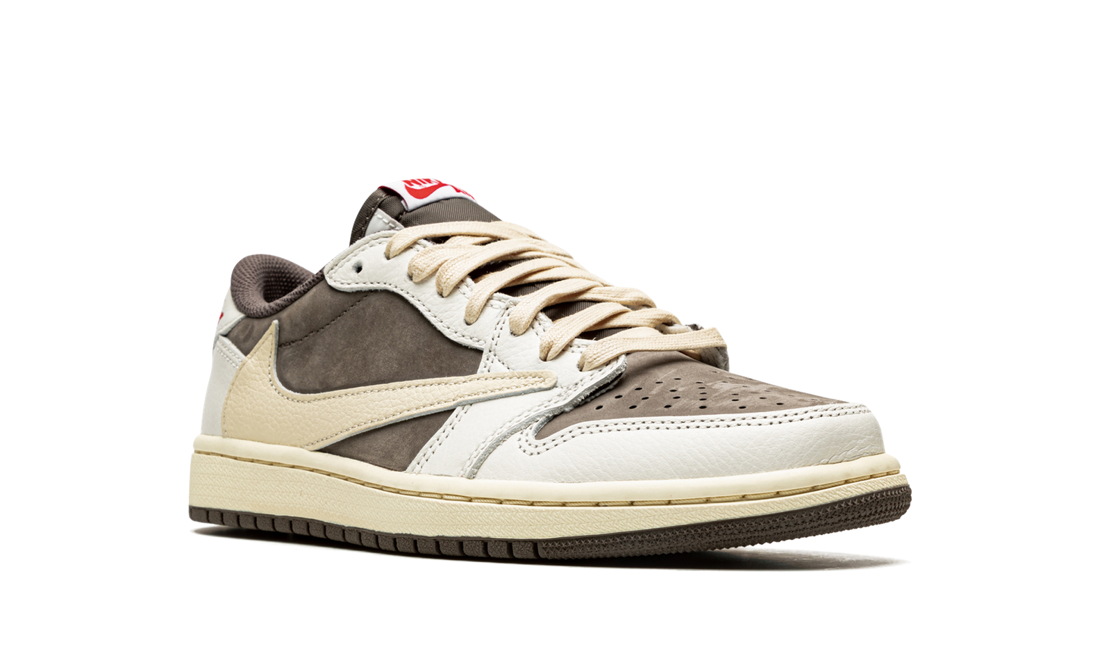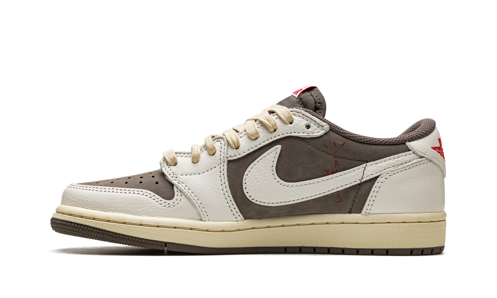 The Travis Scott x Air Jordan 1 Low “Reverse Mocha” is a collaboration between the hip-hop artist and Jordan Brand on the low-top lifestyle shoe that “reverses” the color block of the duo’s original Jordan 1 Low collaboration from 2019. Released in July 2022, the “Reverse Mocha” features the same color block as Travis and Jordan Brand’s “Mocha” or “Cactus Jack” Jordan 1 Low, albeit in a flipped color coordination. The perforated toe, mid-panel, and collar are designed in mocha (brown) nubuck. White leather overlays on the toe cap, forefoot, eyelets, and heel contrast the upper’s earth tone base. A backwards cream-colored leather Swoosh, a signature branding element to many of Travis’s sneaker projects, appears on the sides. A smiley face logo is embroidered in red on the left heel while a classic “Wings” logo is embroidered in red on the right heel. Release date: July 21, 2022