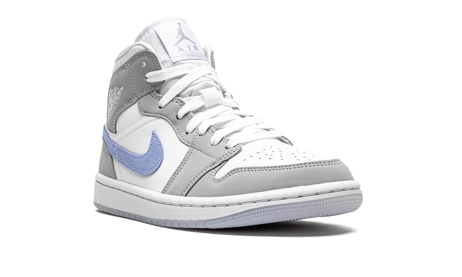 The Women’s Air Jordan 1 Mid “Wolf Grey/Aluminum” is a women’s exclusive look for Michael Jordan’s iconic first signature shoe. Interestingly, the “Wolf Grey/Aluminum” colorway is reminiscent of the white-and-grey color block of the Dior x Air Jordan 1 from 2020, one of the most coveted Air Jordan releases of all time. Like Dior’s high fashion-inflicted take on the retro basketball shoe, the “Wolf Grey/Aluminum” features white leather on the perforated toe, mid-panel, and collar. Contrasting grey leather detailing highlights the look of the forefoot, eyelets, collar, and heel. Unlike the Dior x Air Jordan 1, the “Wolf Grey/Aluminum” is constructed with a blue suede Swoosh on either side. A white “Wings” graphic adorns the collar and a low-contrast, grey Jumpman logo sits above “Air” branding on the white nylon tongue.