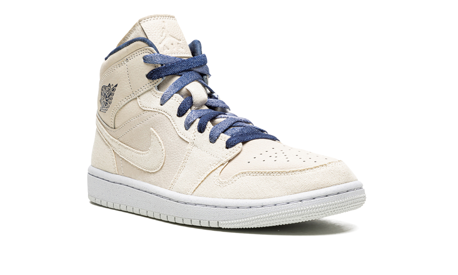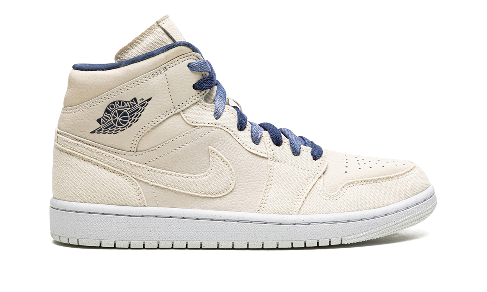 The Women’s Air Jordan 1 Mid “Sanddrift” is a women’s-exclusive colorway of Michael Jordan’s first signature shoe in a clean, neutral look. This casual makeup of the popular Jordan 1 Mid features a mostly monochromatic beige or Sanddrift upper in canvas and leather. The former material is found on the shoe’s toe cap, forefoot, eyelets, and heel. The perforated toe, mid-panel, and collar are constructed in Sanddrift-colored leather. A tonal canvas Swoosh is found on the sides and a Midnight Navy “Wings” logo appears on the collar. Additional navy accenting comes into play on the inner lining and laces. A debossed beige Jumpman logo appears on the tumbled leather tongue tag. Release date: April 12, 2022