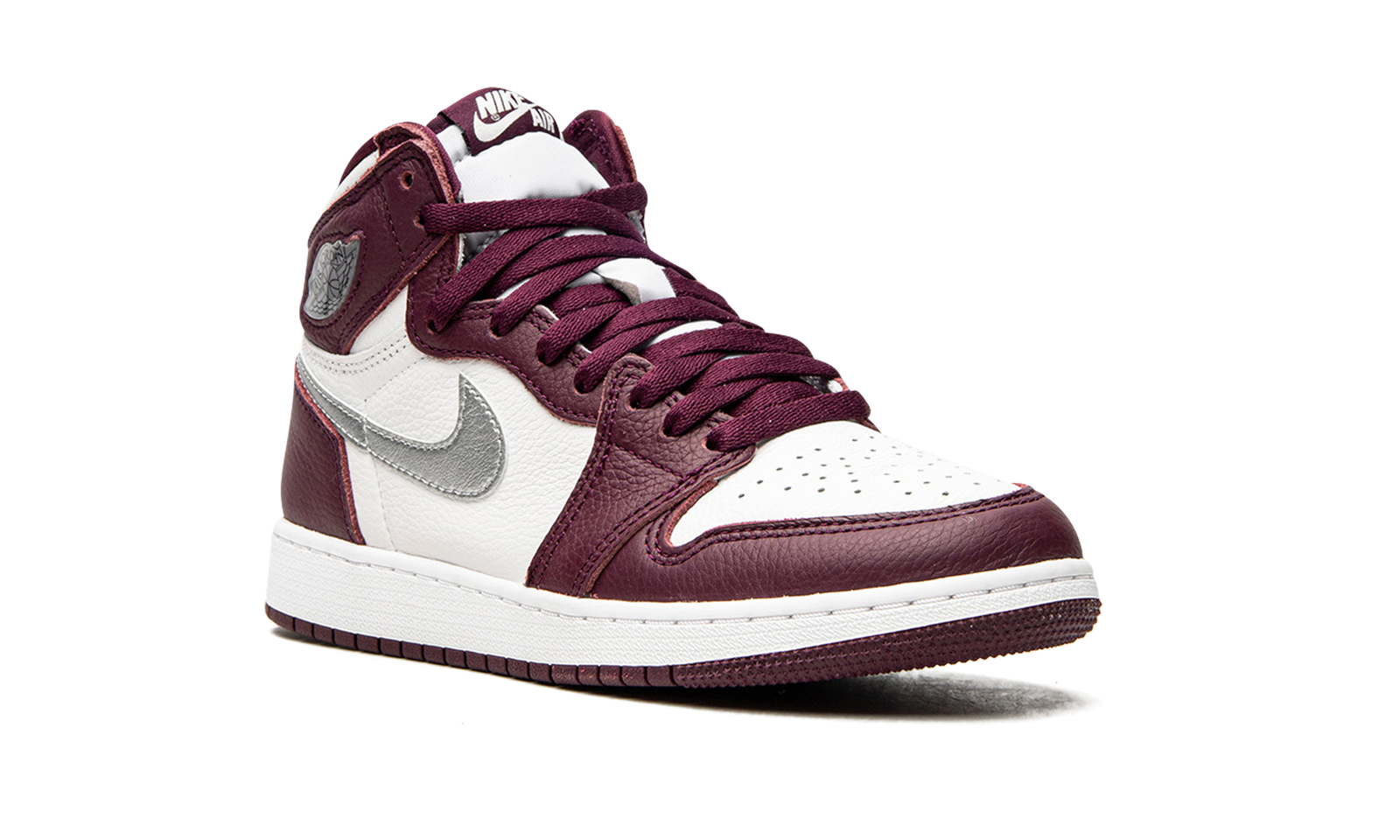 The Air Jordan 1 High OG GS “Bordeaux” is the youth sizing of Michael Jordan’s retro basketball shoe in an autumn-inspired colorway. A November 2021 release, the “Bordeaux” style for the popular high-top shoe is loosely inspired by the Air Jordan 6 and Air Jordan 7 colorway of the same nickname. The Air Jordan 1 continues the ‘90s theme with a mostly two-tone, white-and-maroon-colored look. The perforated toe, mid-panel, and collar are arranged in white tumbled leather. Contrasting wine-red Bordeaux leather can be found on the forefoot, eyelets, collar, and heel. A Metallic Silver leather Swoosh graces both sides of the shoe and a silver “Wings” logo is located on the collar. Classic white “Nike Air” branding is printed on the Bordeaux nylon tongue tag on the top of the white nylon tongue. Release date: November 20, 2021