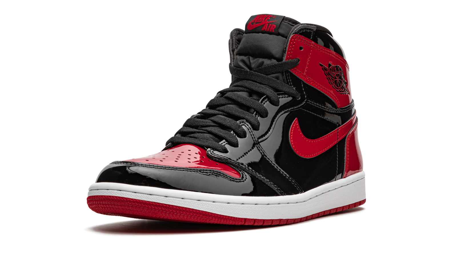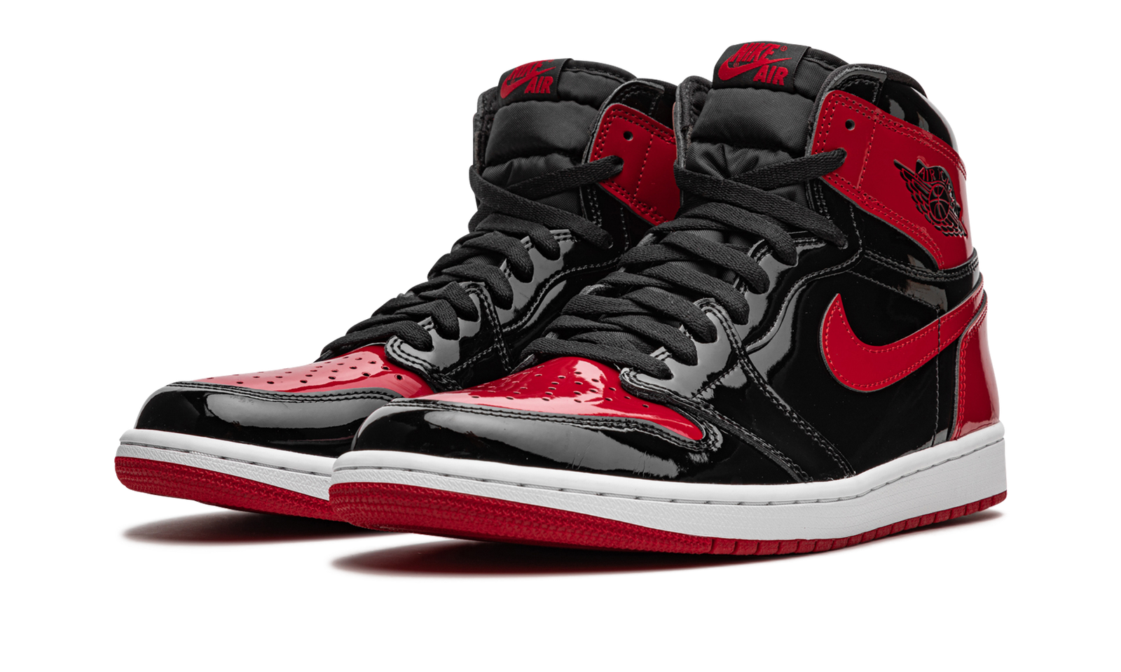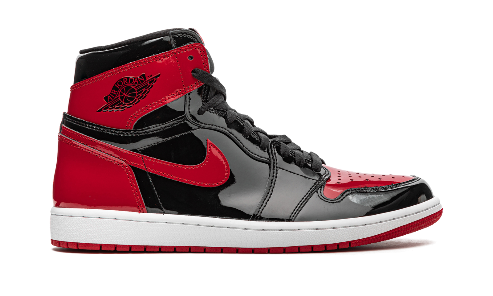 The Air Jordan 1 High OG “Patent Bred” updated an original colorway of Michael Jordan’s first signature shoe with a patent leather finish. Based on the iconic “Bred” colorway, the aptly named “Patent Bred” features a modified patent leather construction. Much like the original “Bred,” Varsity Red leather detailing can be found on the perforated toe, collar, heel, and Swoosh, though in patent leather. Black patent leather forms the base. A black “Wings” logo can be found on the collar and red “Nike Air” detailing appears on the black nylon tongue tag on the black nylon tongue. A white rubber midsole and Varsity Red-colored outsole complete the look.