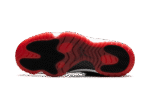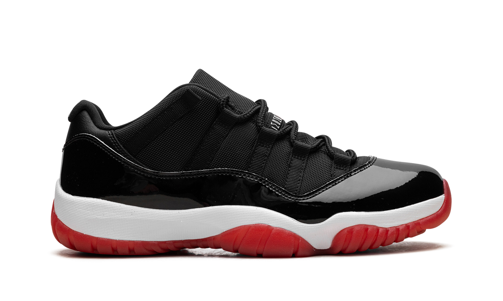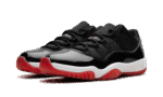 The Air Jordan 11 Low “Bred” is a low-top, black and red colorway of Michael Jordan’s 11th signature shoe. The 2025 edition of the AJ11 Low “Bred” stays true to the original design. It has a black mesh upper that is accented with the Jordan 11’s signature patent leather mudguard and a transluscent red outsole.