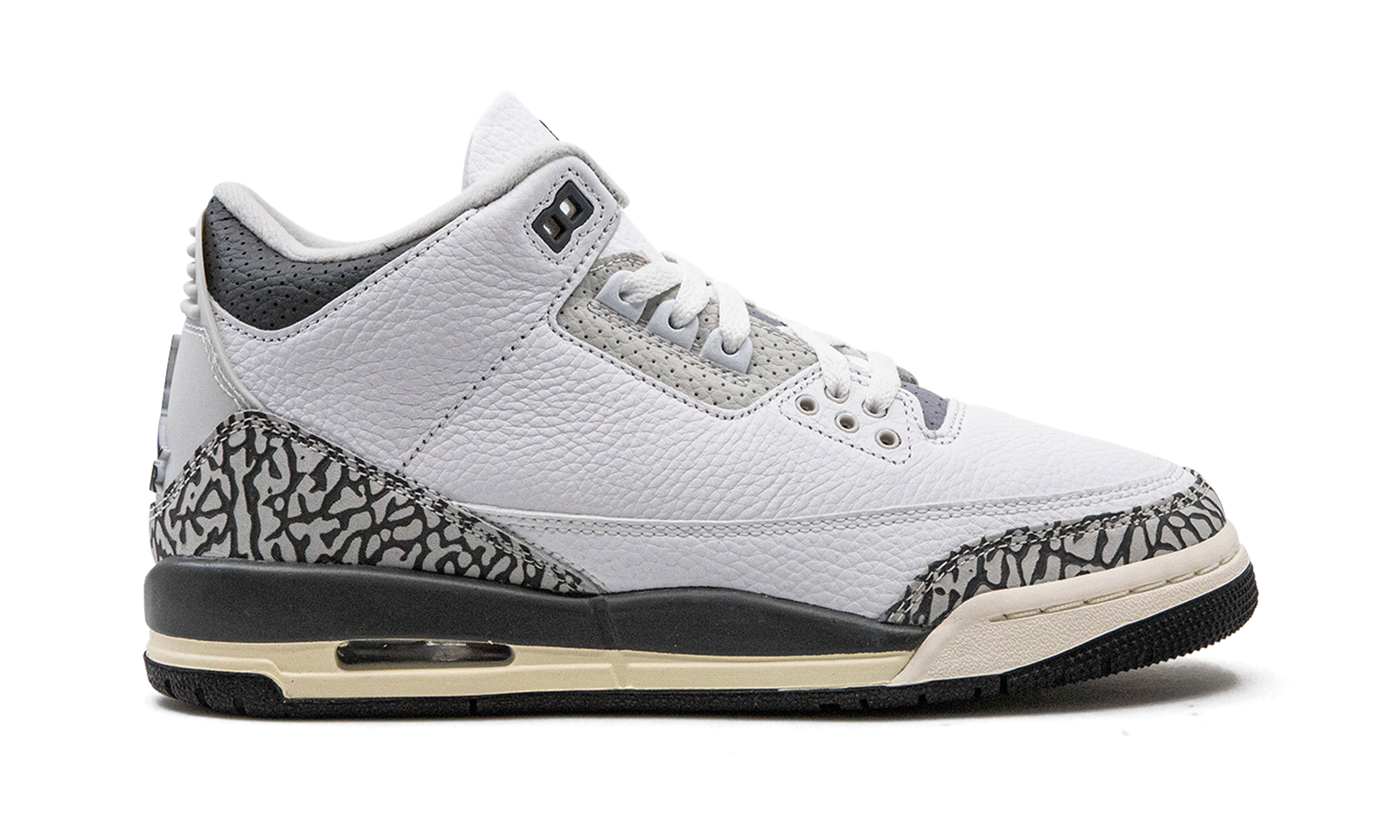 The Air Jordan 3 GS “Hide N’ Sneak” is a kid’s-only colorway of Michael Jordan’s third signature shoe that celebrates Children’s Day 2023. This special edition Jordan 3 in youth sizing features a white leather construction with grey elephant print on the toe and heel. Additional grey leather accenting appears on the eyelet panel, tongue, and collar. Classic Jumpman and “Air” branding are found on the heel. A Jumpman is also embroidered on the tongue. Underfoot, a Sail midsole and black rubber outsole complete the fun colorway. The shoe comes with a removable cartoon elephant patch. Release date: June 6, 2023