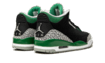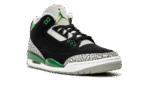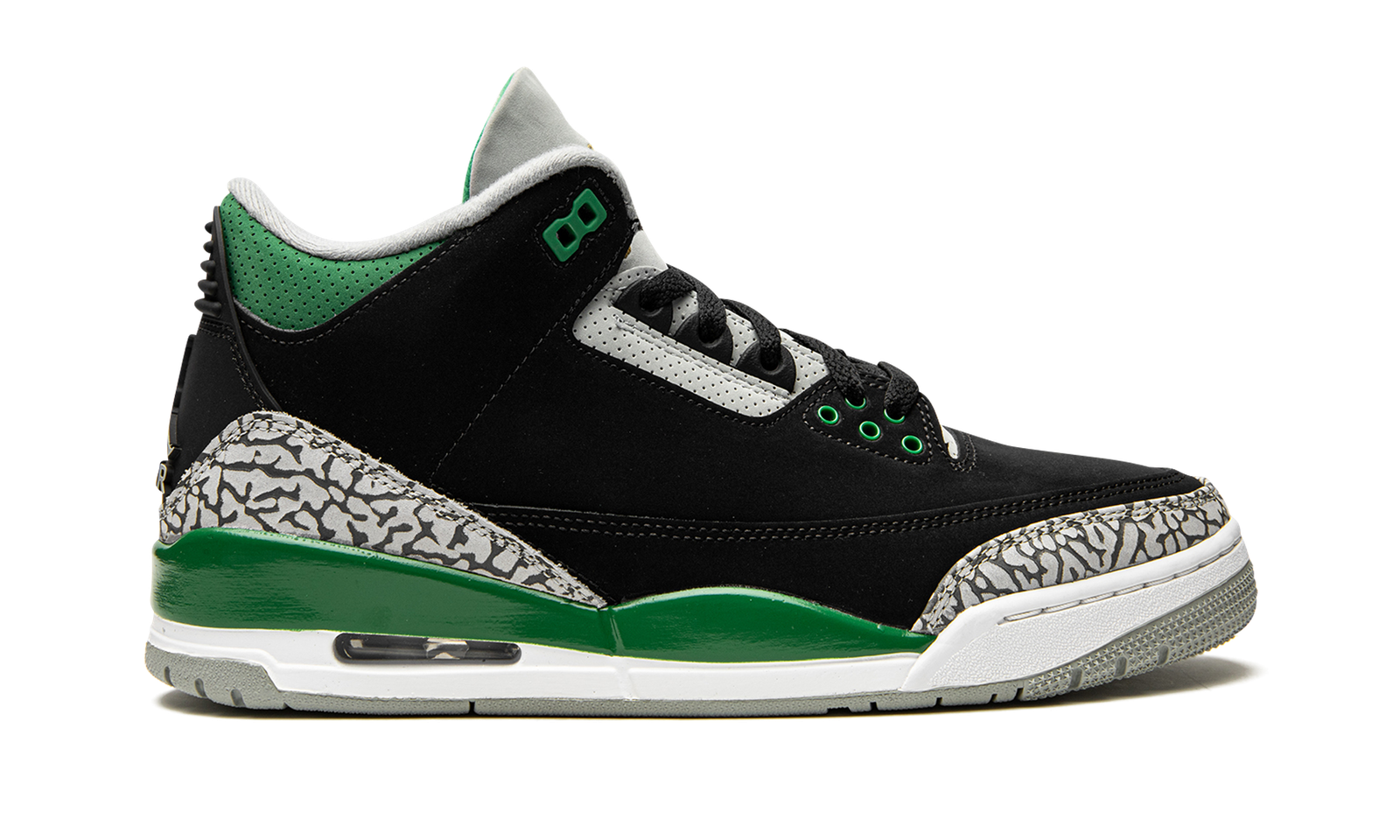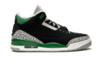 The Air Jordan 3 “Pine Green” is a Fall 2021 release of Michael Jordan’s third signature shoe in a colorway that mimics the look of an Oregon Ducks Player Exclusive model. In no way affiliated with the Nike sponsored university, the “Pine Green” is nonetheless a worthy tribute to the many classic Oregon Duck Player Exclusive colorways as the shoe is arranged in the same black, grey, and green color block of several hard-to-come-by Oregon PEs. The upper features a black tumbled leather construction with grey elephant print on the toe and heel. Pine Green accenting comes into play on the painted mudguard on the sides and on the dotted leather collar, top eyelets, and Jumpman on the grey leather tongue. A white Jumpman with an “Air” logo is found on the heel. Consistent with the original look of the Air Jordan 3, a small visible Air bubble appears in the heel of the white midsole. Release date: October 30, 2021