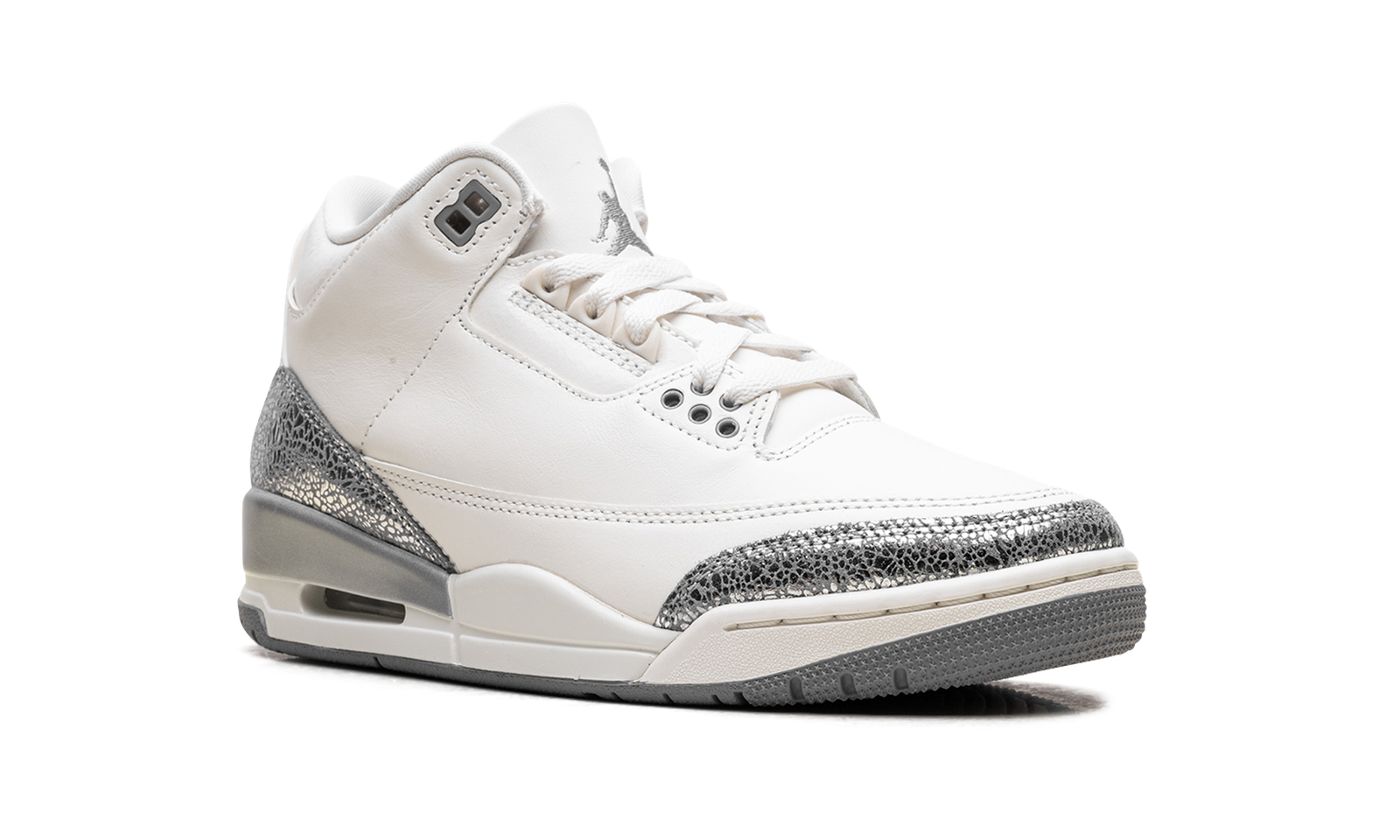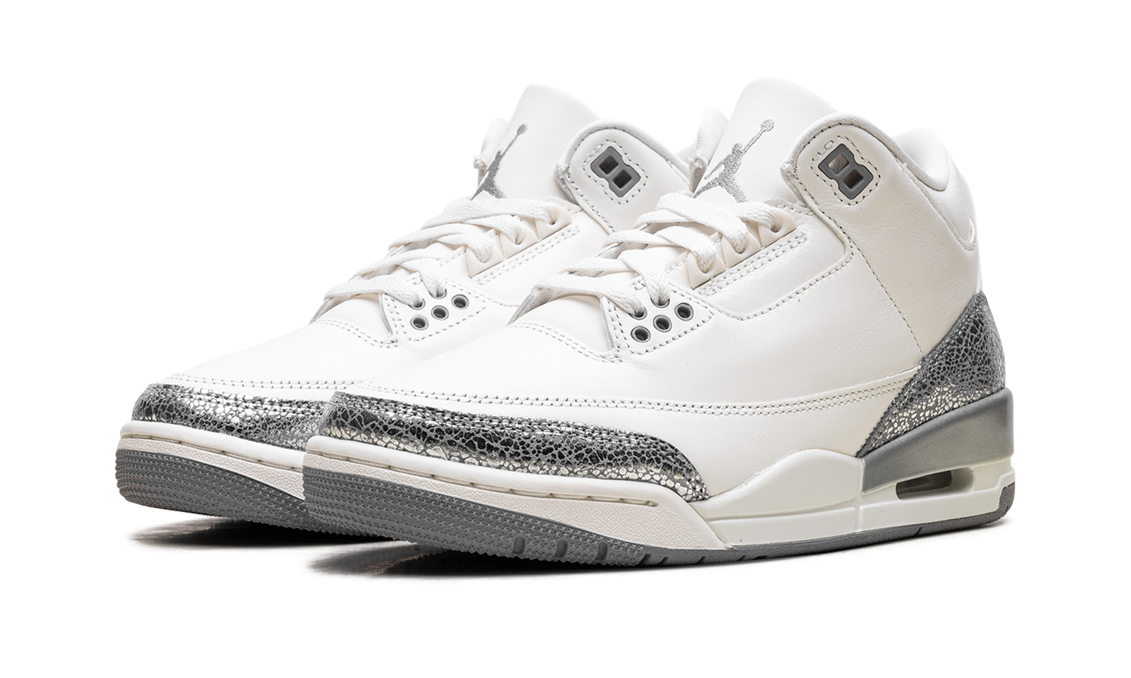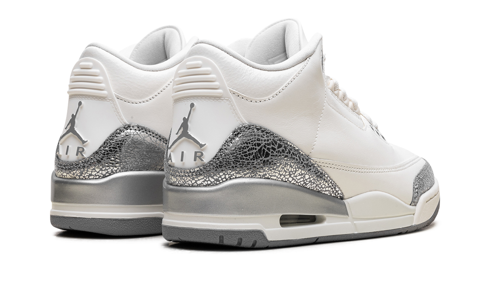 The Air Jordan 3 WMNS “Sail Cement Grey” is a women’s colorway of Michael Jordan’s third signature shoe. This AJ3 has unique details around the toe and heel where the Jordan 3’s traditional elephant print panels are done in a shiny metallic silver that makes these women’s Jordans really pop.