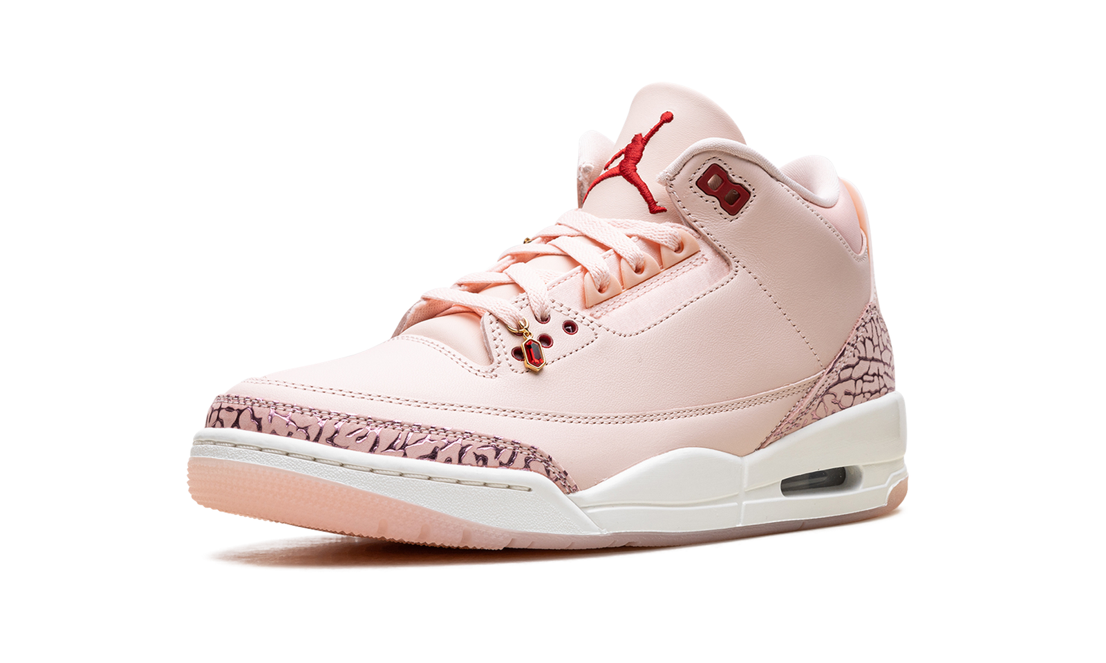 The Air Jordan 3 “Treat Yourself” is a Valentine’s Day-themed colorway of Michael Jordan’s third signature sneaker. The AJ3 “Treat Yourself” features a light pink upper that is accented with jewel charms. The Jordan 3 has pops of bright Gym Red on the tongue and the heel as well as a translucent outsole.