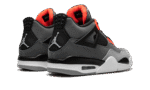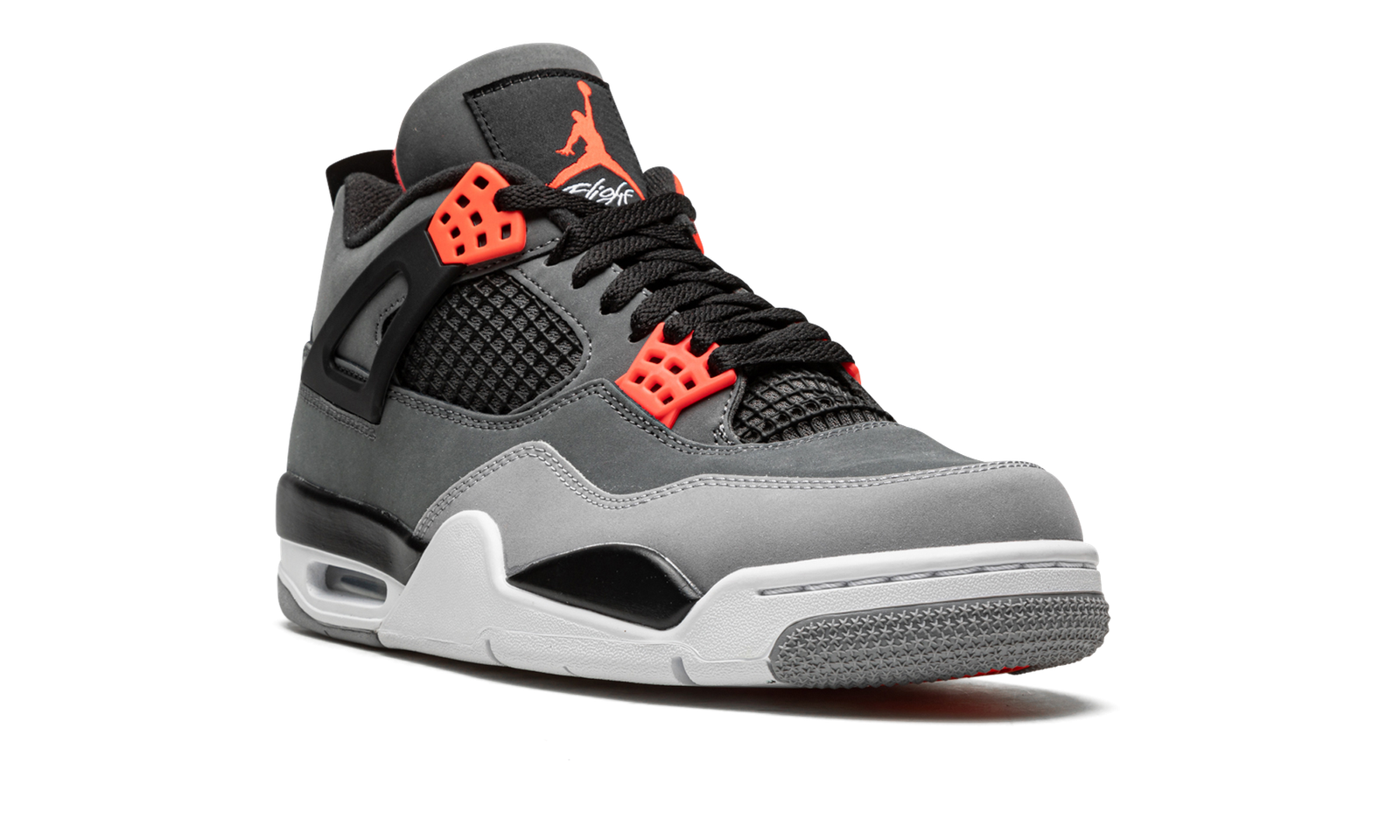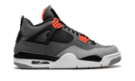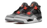 The Air Jordan 4 “Infrared” is a February 2021 release of the vintage basketball shoe in a colorway loosely inspired by the Chicago Bulls, Michael Jordan’s former basketball team. The “Infrared” Jordan 4 also mimics the color block of the model’s “Green Glow” colorway from 2013, trading the latter’s green accents for Infrared. The shoe features a synthetic nubuck upper in light and dark grey. Black accenting can be found on the netting found on the tongue and mid-panel, on the “wings,” and inner lining. Lighter shades of grey appear on the toe and outsole. A light grey Jumpman is located on the black heel counter and an Infrared Jumpman is printed on the black nylon tongue tag on the tongue. Additional Infrared detailing is found on the eyelets. Underfoot, a visible Air bubble in the white midsole completes the look. Release date: February 8, 2022