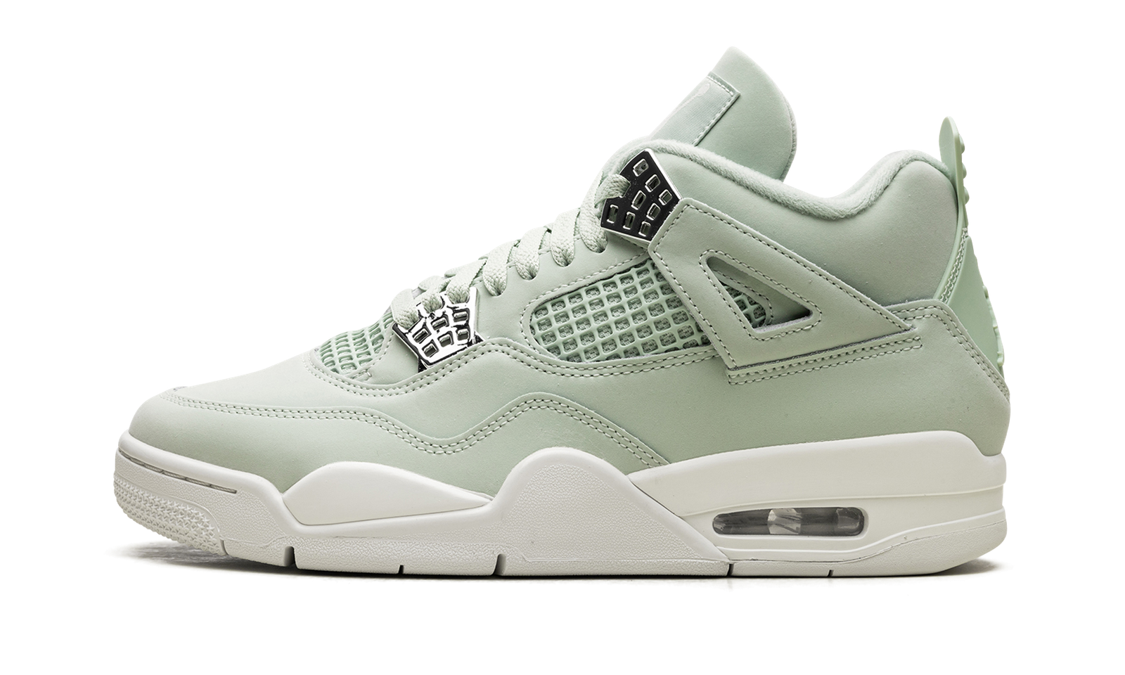 The Air Jordan 4 “Seafoam” is a women’s colorway of Michael Jordan’s fourth signature shoe. This Jordan 4 has a clean, light green upper that is balanced with a white midsole. The “Seafoam” AJ4 incorporates the signature design details of the Air Jordan 4, including the mesh panels and wings on the side. A tonal Jumpman logo appears on the heel.