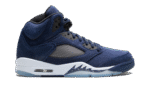 The Air Jordan 5 “Midnight Navy” is a colorway of the retro basketball shoe loosely inspired by the Georgetown Hoyas college basketball team. While not affiliated with the Hoyas, the “Midnight Navy” updates Michael Jordan’s fifth signature shoe with a dark navy blue textile upper with suede on the heel, collar, and toe panels. Smoky translucent netting appears on the side and tongue. A black Jumpman is embroidered on the heel and textile tongue. Navy shark tooth detailing with white speckling on the light grey midsole sits above the solid navy and translucent outsole. Release date: November 10, 2023