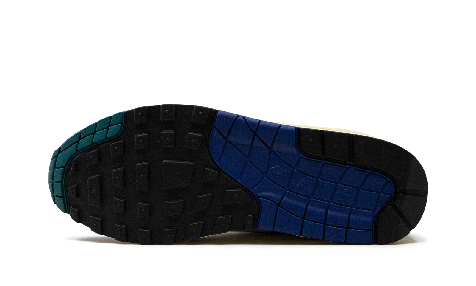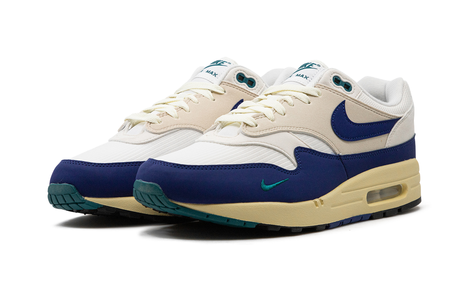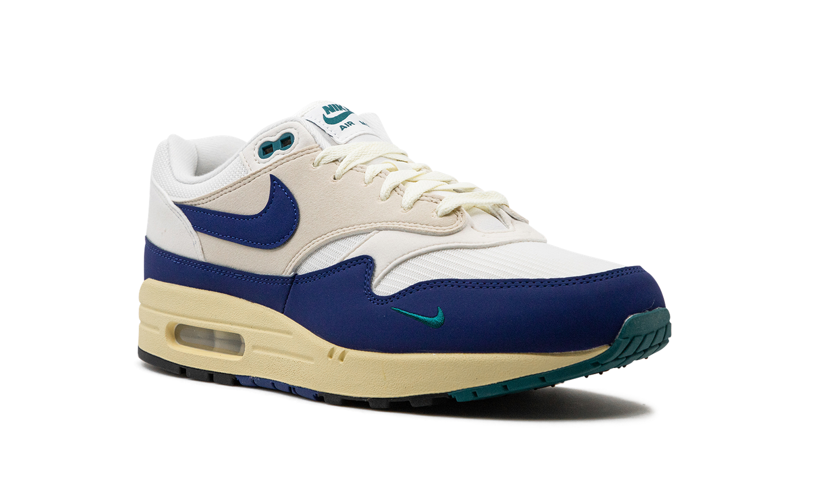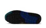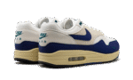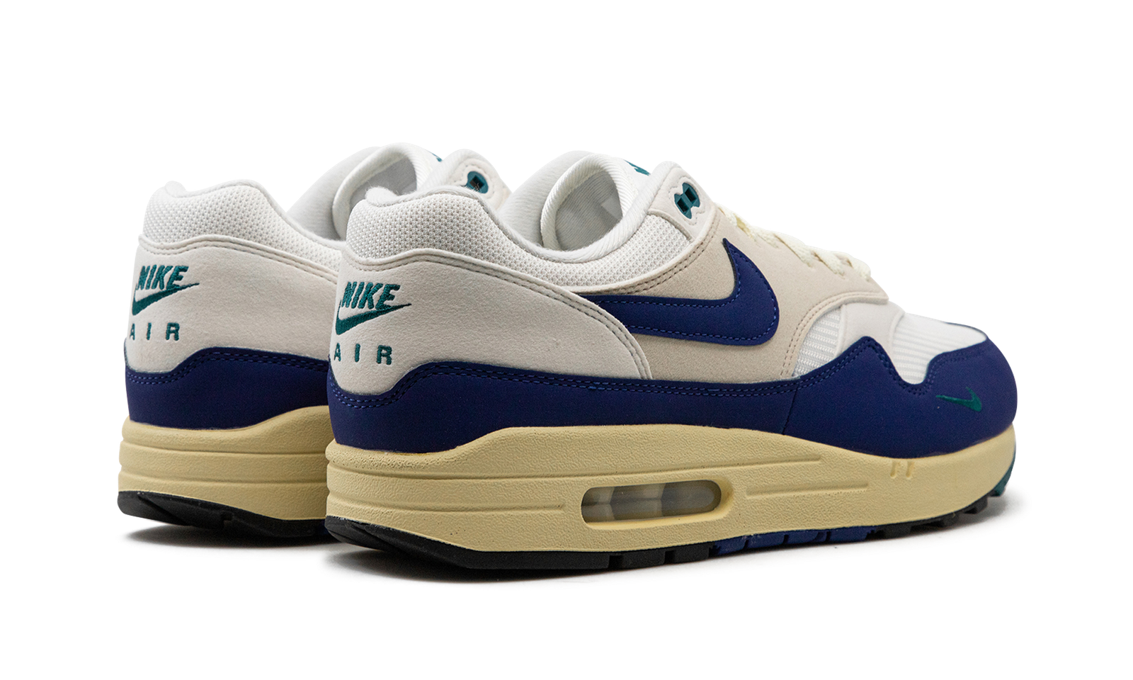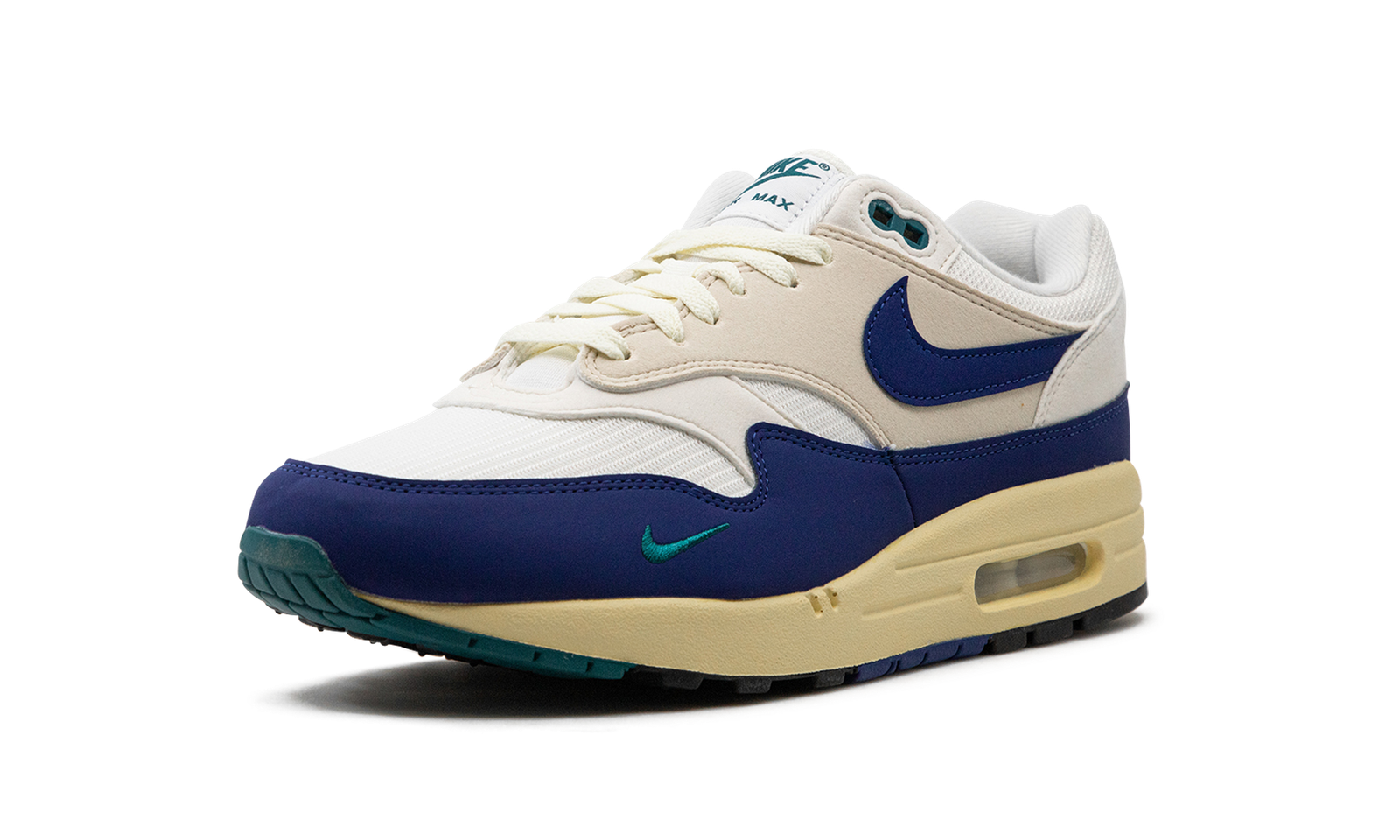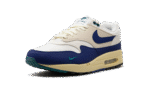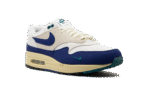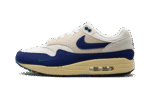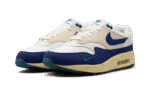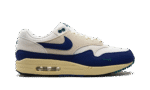 The Nike Air Max 1 “Athletic Department – Deep Royal Blue” is a colorway of the retro sneaker with a decidedly vintage design. The upper has a white textile base with a light tan felt overlay on the mid-panel. A Deep Royal Blue synthetic nubuck mudguard and Swoosh add a pop of color to the shoe’s design. Fir-colored Swoosh branding is embroidered on the lateral side of the forefoot, and Fir “Nike Air” branding is embroidered on the heel. Underfoot is an aged-looking cream white foam midsole that ties into the Air Max 1’s old school vibe.