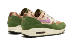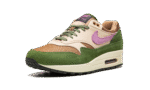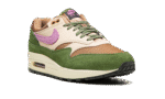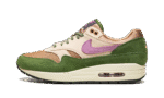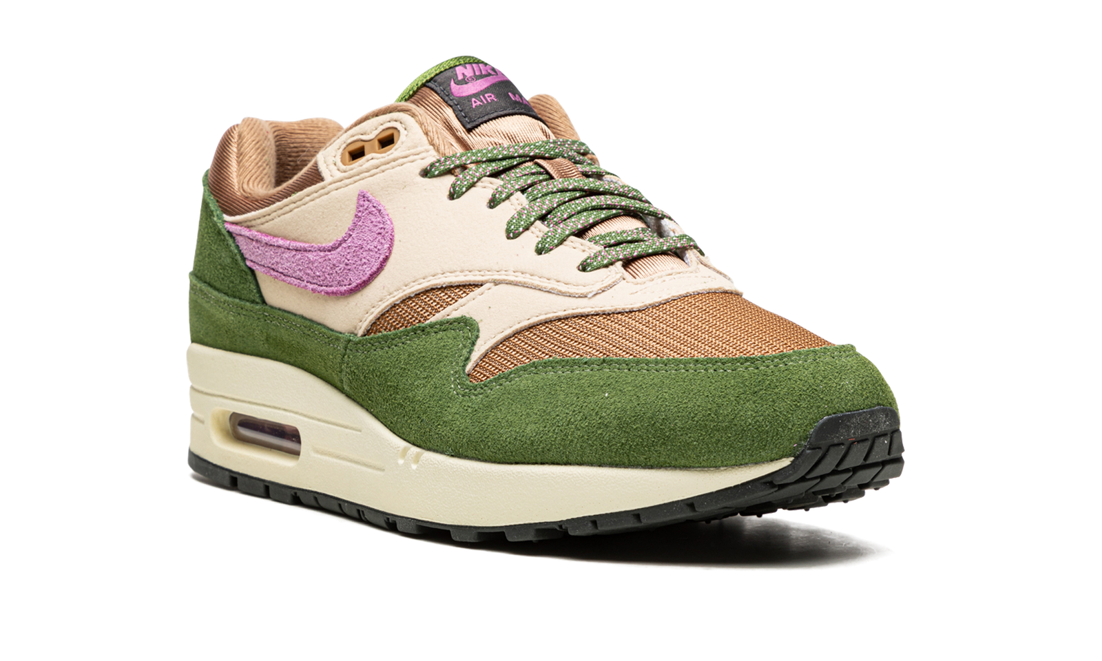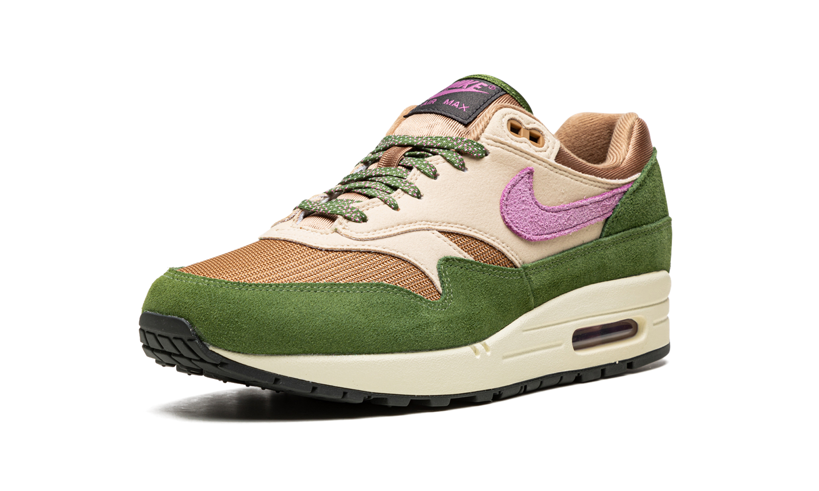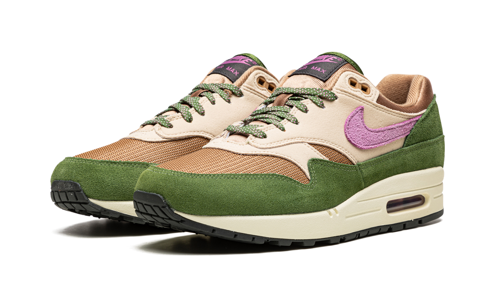 The Nike Air Max 1 “Treeline” is a March 2022 release of the retro running shoe that draws favorably from an iconic Nike SB Dunk colorway. The “Treeline” looks to the design of none other than the “Skunk” SB Dunk from 2010, a highly desirable release that celebrates the cheeky, marijuana-themed “4-20” holiday. While not exactly identical in appearance, the “Treeline” nonetheless features the same color pattern as the “Skunk.” The base of the upper is constructed in brown mesh. The overlays appear in beige nubuck and a hairy purple suede Swoosh is found on either side of the shoe. The toe-to-heel mudguard is arranged in green suede. Classic “Nike Air” branding appears in purple on both the heel and the tongue tag. Green laces with speckle detailing add to the “Skunk” vibe of the “Treeline.” Release date: March 19, 2022