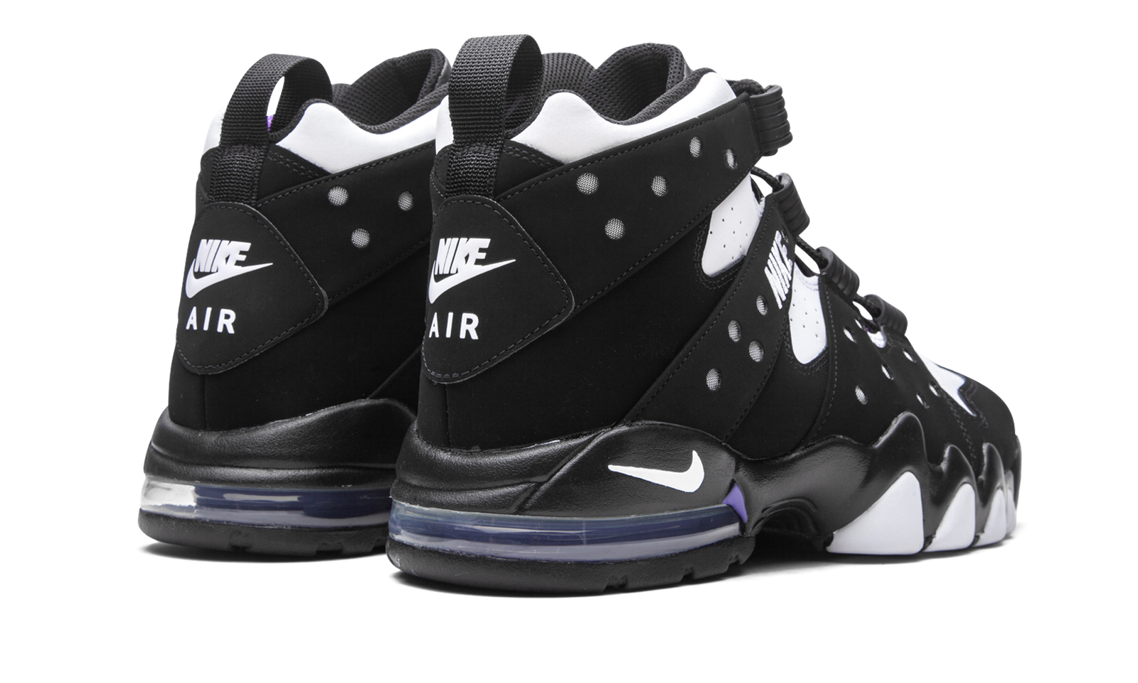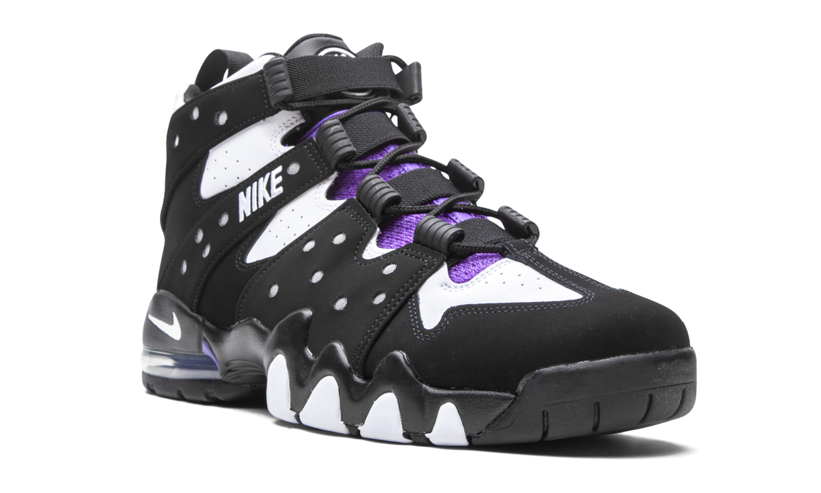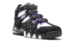 The Nike Air Max 2 CB ‘94 “2020 Retro” is an original colorway of Charles Barkley’s signature performance basketball shoe from the ‘90s. Quintessentially retro from a design standpoint, the Air Max 2 CB ‘94 returns in its true-to-original form for this Fall 2020 release. The design by Tinker Hatfield, which is inspired by the look of a straitjacket, features a split white leather and black synthetic nubuck design along the eyelets and midsole, respectively. White “Nike” embroidery appears on the midfoot harness that supports the lacing system. Additional details include purple accenting on the nylon tongue, white “Nike Air” embroidery on the heel, and a mini Swoosh on back of the midsole. A visible Air unit in the heel with purple accenting completes the look of this classic hoops silhouette from Nike Basketball.