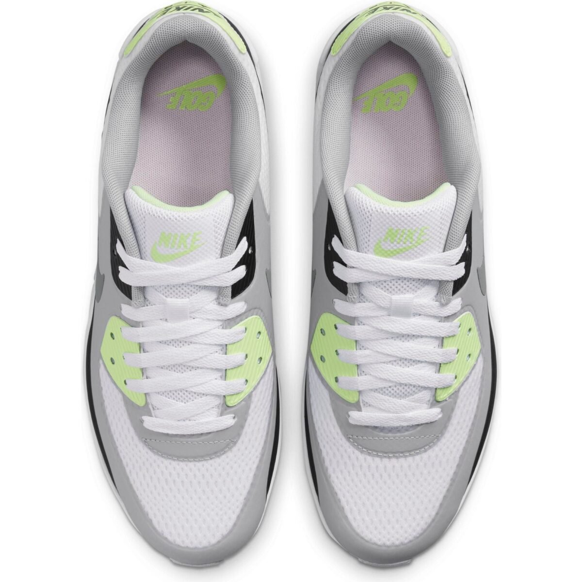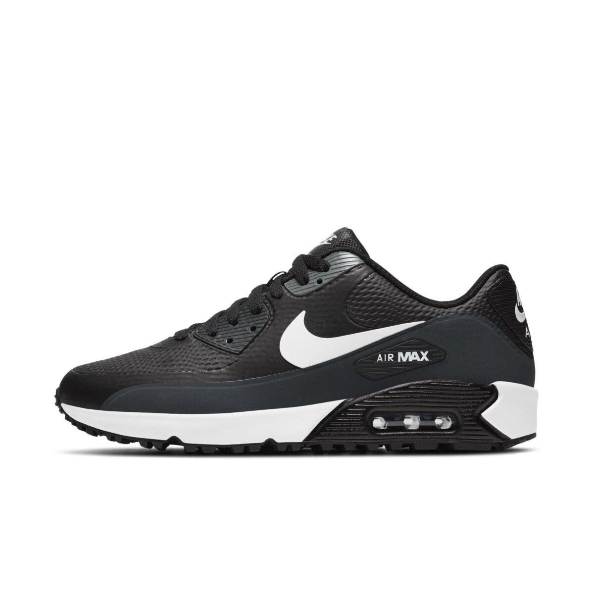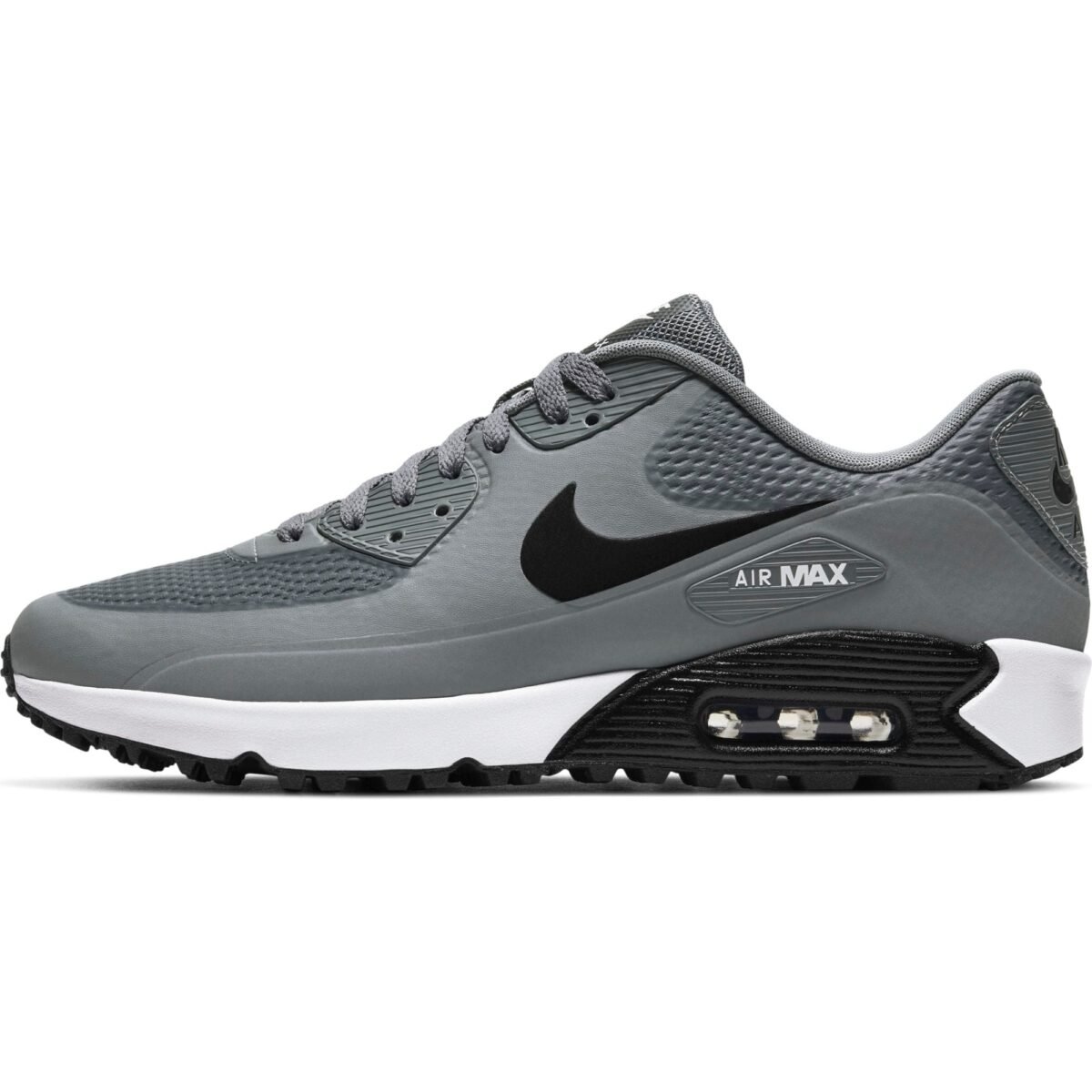 A combination of fused overlays, additional eyestays and strategically placed mesh capture the look of the original men’s Nike Air Max 90 golf shoe. The mesh has a thin, flexible overlay that helps keep out water and makes it easy to clean your shoes.