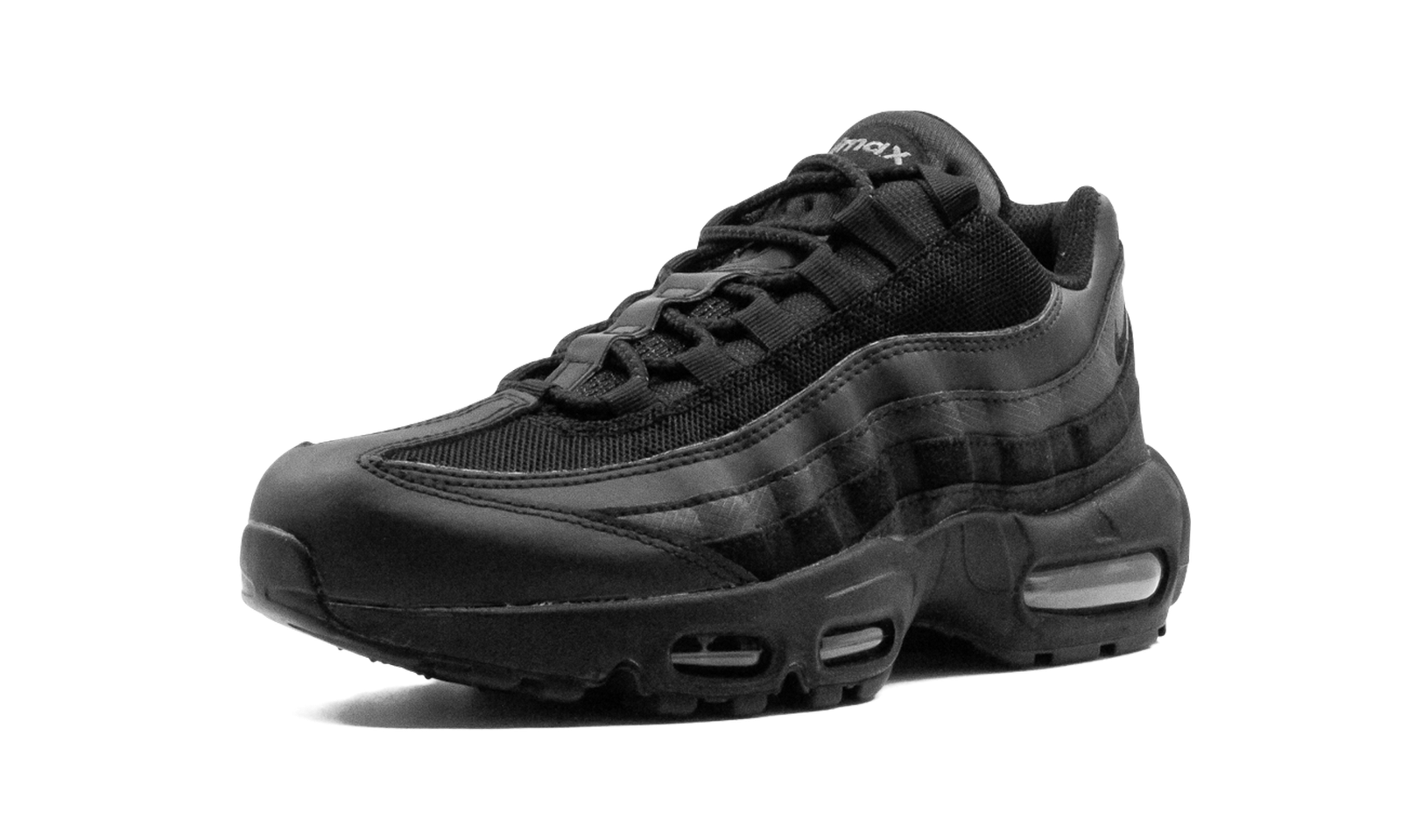 The Nike Air Max 95 “Triple Black” is a versatile, monochromatic black colorway of the classic running shoe. Designed in an all-black-everything style, the aptly named “Triple Black” Air Max 95 features a black mesh base with tonal wavy layered leather panels on its design. A black Swoosh is embroidered on the lateral side of the collar. Classic “Air Max” branding is stitched onto the tongue. Reflective detailing can be found on the tongue and on the back of the shoe. Underfoot, the design is complete with a black foam midsole with visible Max Air cushioning units in the forefoot and heel.