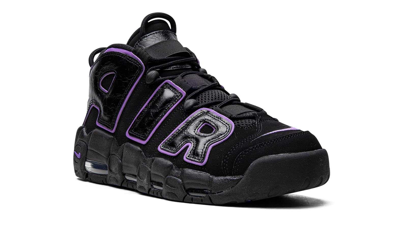 The Nike Air More Uptempo “Action Grape” is a unique black-and-purple colorway of Scottie Pippen’s former signature shoe. The Air More Uptempo was worn by Pippen with the Chicago Bulls back in 1996. Now, the retro basketball shoe is one of the most popular lifestyle sneakers in the world. Appearing in “Action Grape,” the shoe features a mostly monochromatic black appearance, save for the purple accenting along the black leather “AIR” branding on the sides and the Swoosh logos on the toe, heel, and lateral midsole. The shoe’s base is designed in a combination of smooth and dotted black leather. Underfoot, the black foam midsole with visible Air units completes the look. Release date: August 27, 2022