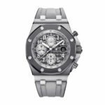 The Audemars Piguet Royal Oak Offshore Replica 26470IO.OO.A006CA.01 is a 1:1 super clone Swiss mechanism watch. It features a 904L stainless steel case with a grey bezel, a sapphire crystal, and a 42.00mm size and 14.18mm thickness. The movement is an Automatic AP 3126 / 3840 with a 60-hour power reserve and a precision of (-3/+3 sec/day) within COSC certification limits. The dial is silver-toned with Arabic numerals and Royal Oak hour-marker and hands. The bracelet is a rubber dark grey adjustable link with a 904L stainless steel pin clasp.
