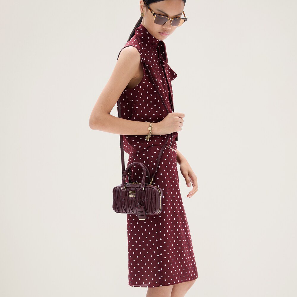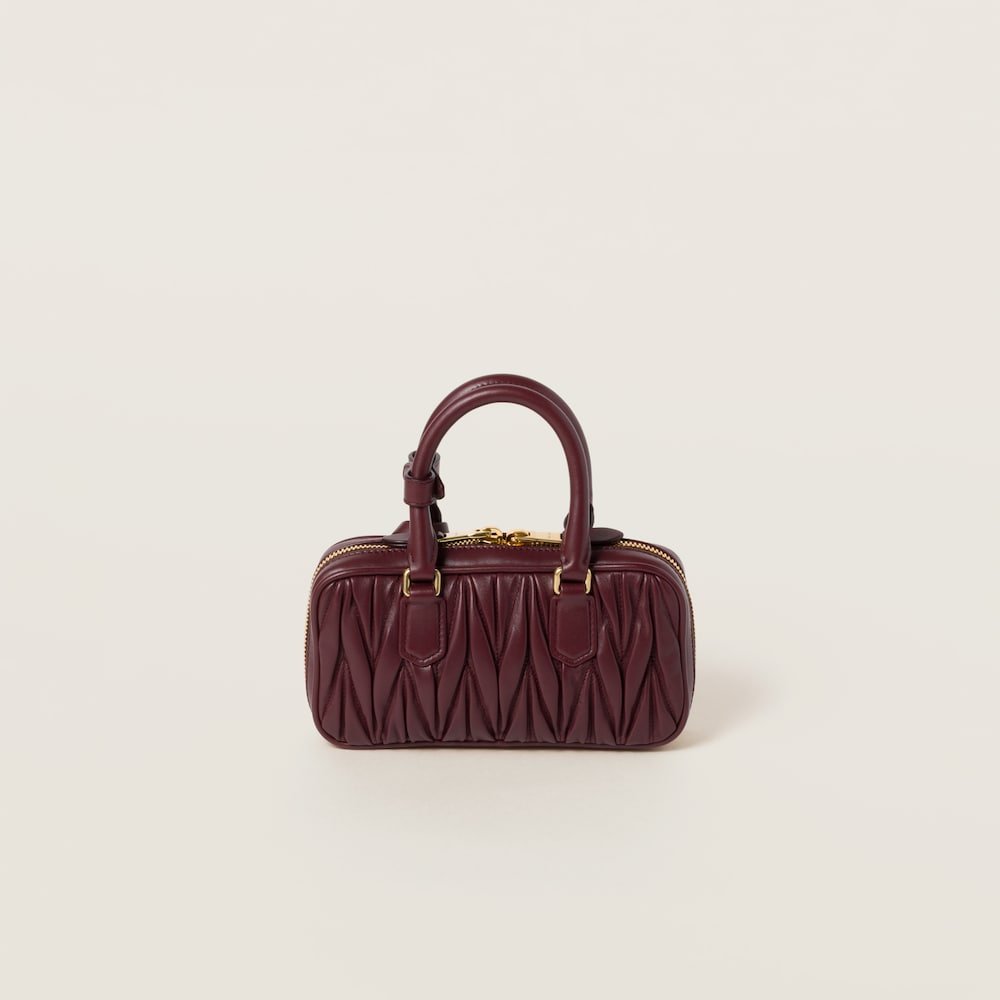 Fine matelassé workmanship reinterprets the classic silhouette of the top-handle bag, giving it a three-dimensional, textured, and extremely sophisticated effect. The lettering logo on the front, which echoes the finish of the metal hardware, stands out against the refined artisan workmanship with an iconic and immediately recognizable touch. The dynamic and elegant lines of this mini format and the detachable, adjustable shoulder strap contribute to the versatile, functional, and modern design of the bag.