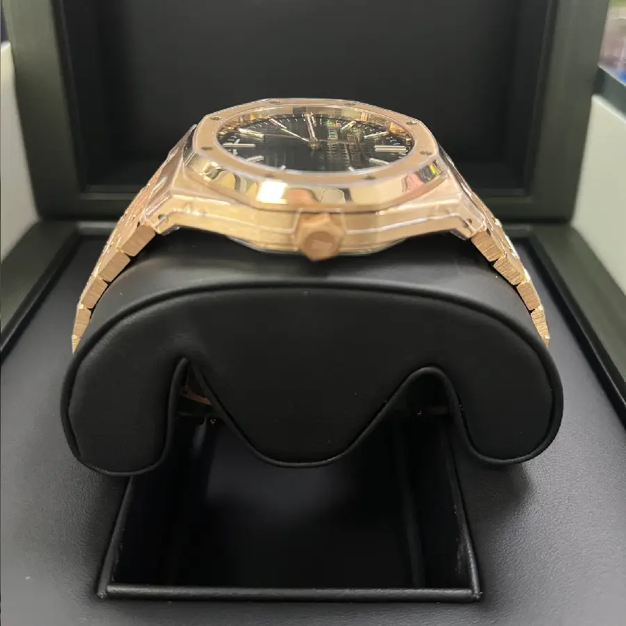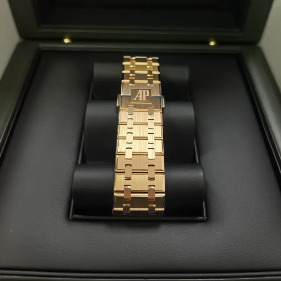 The 41 mm case is crafted from solid 904L stainless steel with a rich rose gold finish, perfectly matched with a Royal Oak integrated bracelet and folding AP clasp. The sapphire crystal provides durability and clarity while preserving the slim, elegant profile of the watch.