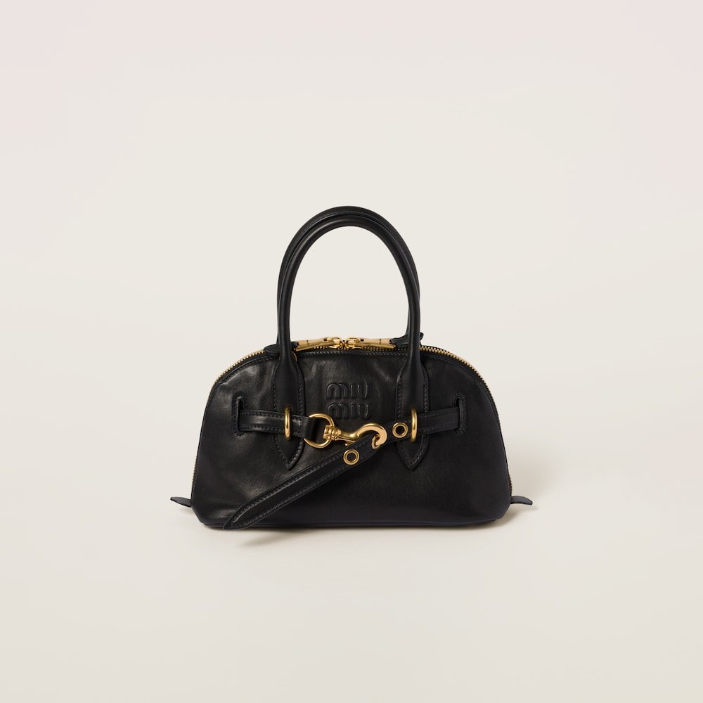 The Aventure top-handle bag, recovered from the Miu Miu archives, has been reinterpreted in terms of a lighter structure and attitude, creating a classic style with timeless charm. The embossed lettering logo completes the design with an iconic note.