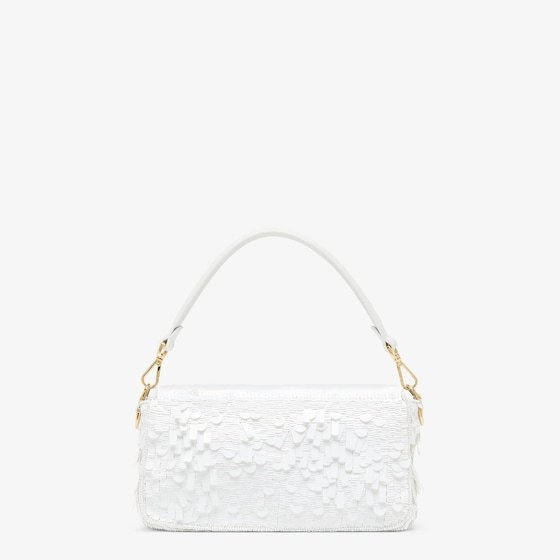 Iconic medium Baguette bag embroidered all-over with white metallic sequins in different shapes and sizes. Decorated with an FF clasp.