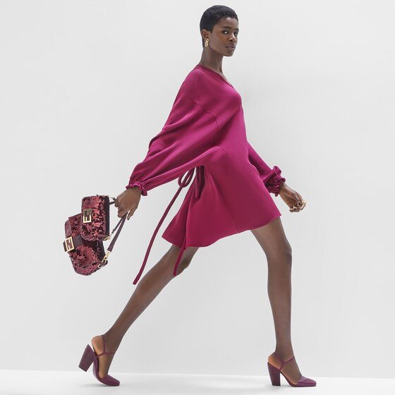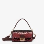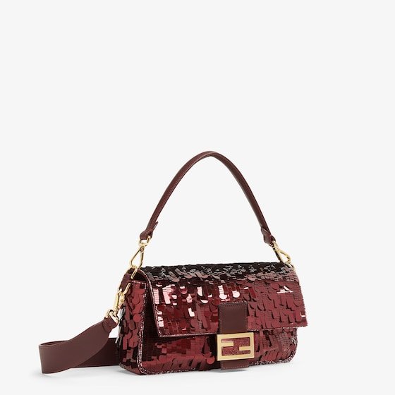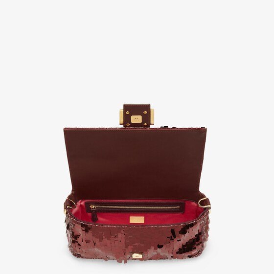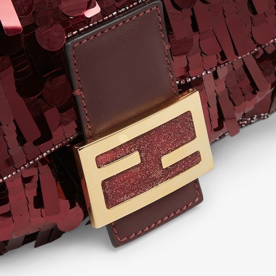 Iconic medium Baguette bag, part of the collection curated with designer Stefano Pilati, embroidered all-over with burgundy metallic sequins in different shapes and sizes. Decorated with an FF clasp.