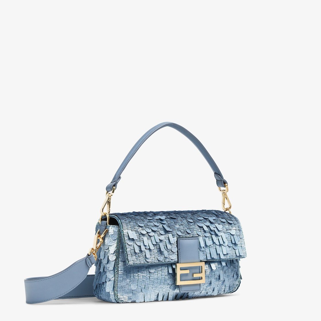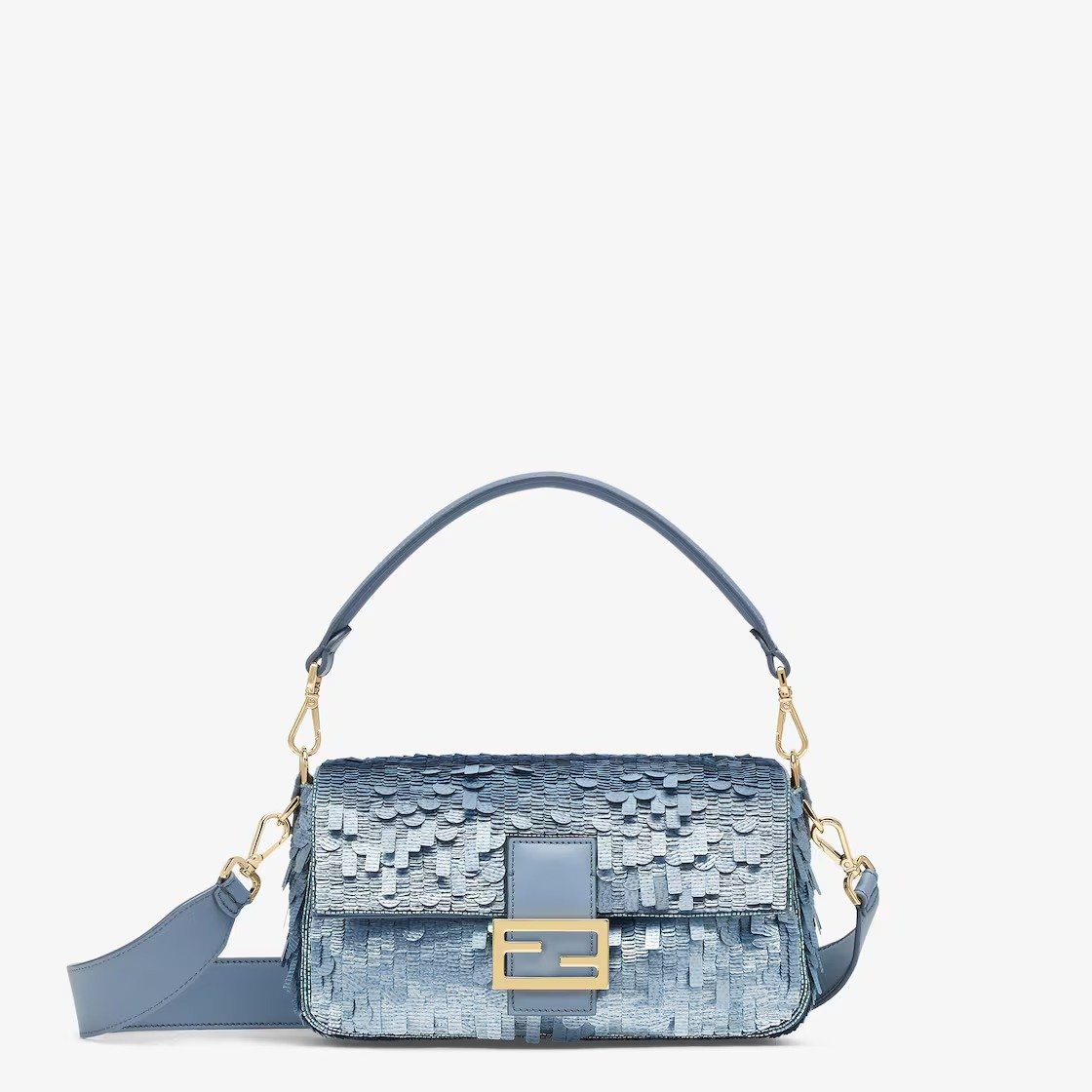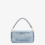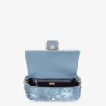 Hand-embroidered with light blue sequins of different shapes and sizes with a denim-effect finish. Trimmed in light blue calfskin and embellished with an FF clasp.