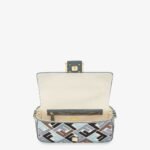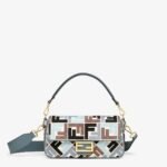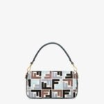 Iconic medium Baguette bag, made of natural-colour canvas with an embossed FF motif embroidered in multicolour thread in light blue, blue and brown. Embellished with a blue leather trim and FF clasp.