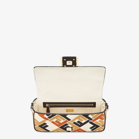 Iconic medium Baguette bag, made of natural-colour canvas with a raised FF motif embroidered in multicolour brown thread. Embellished with a black leather trim and FF clasp.
