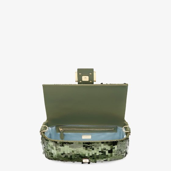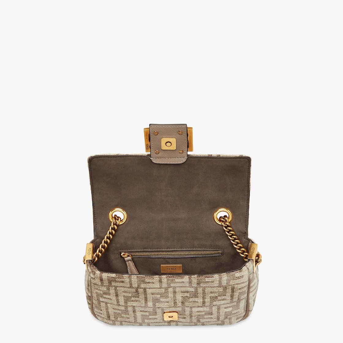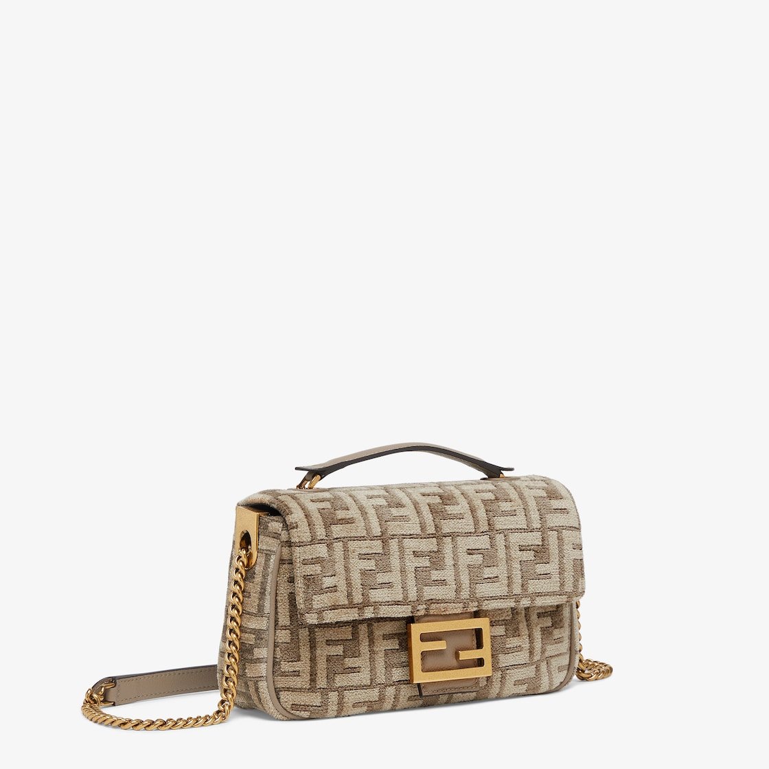 Iconic medium Baguette bag with chain, part of the collection curated with designer Stefano Pilati, made of tapestry-effect dove-grey chenille with a contrasting FF motif. Decorated with an FF clasp.