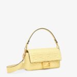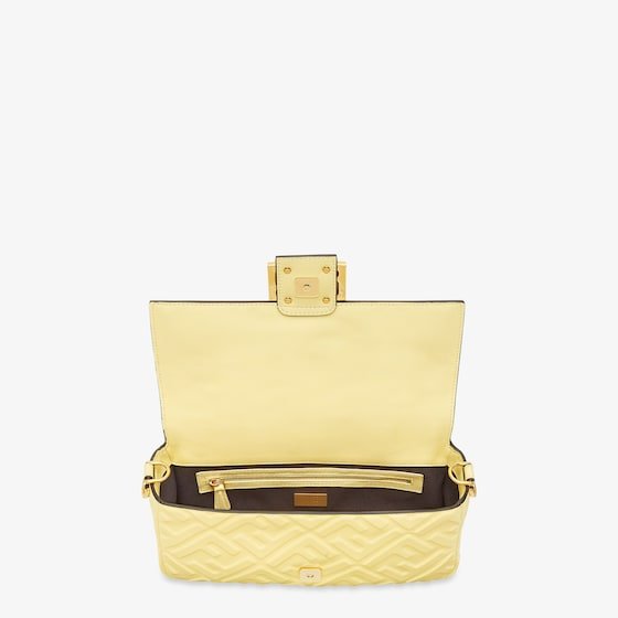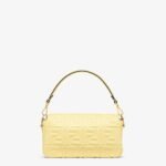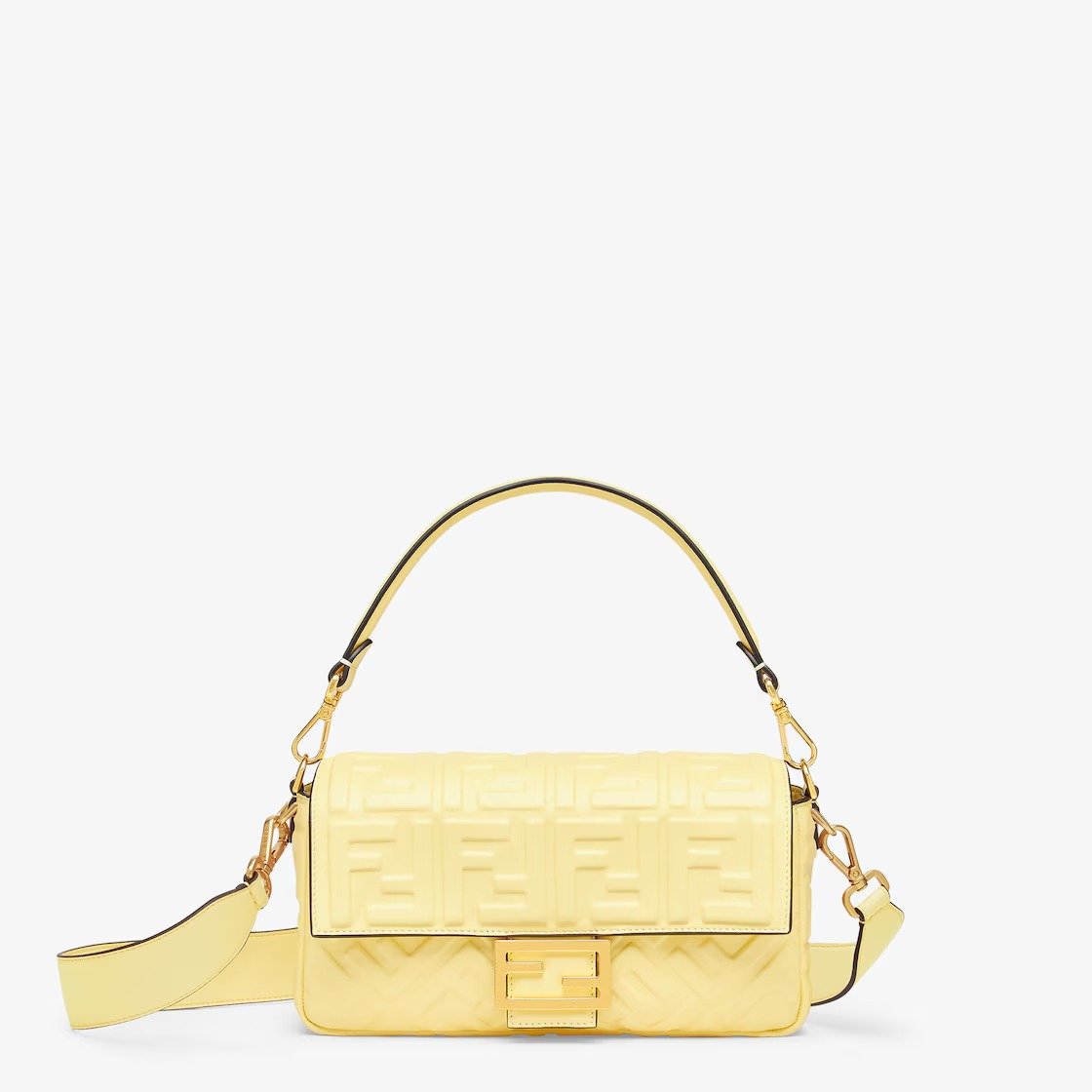 Iconic medium Baguette bag made of yellow soft nappa leather with a three-dimensional textured embossed FF motif. Decorated with an FF clasp.