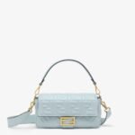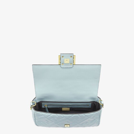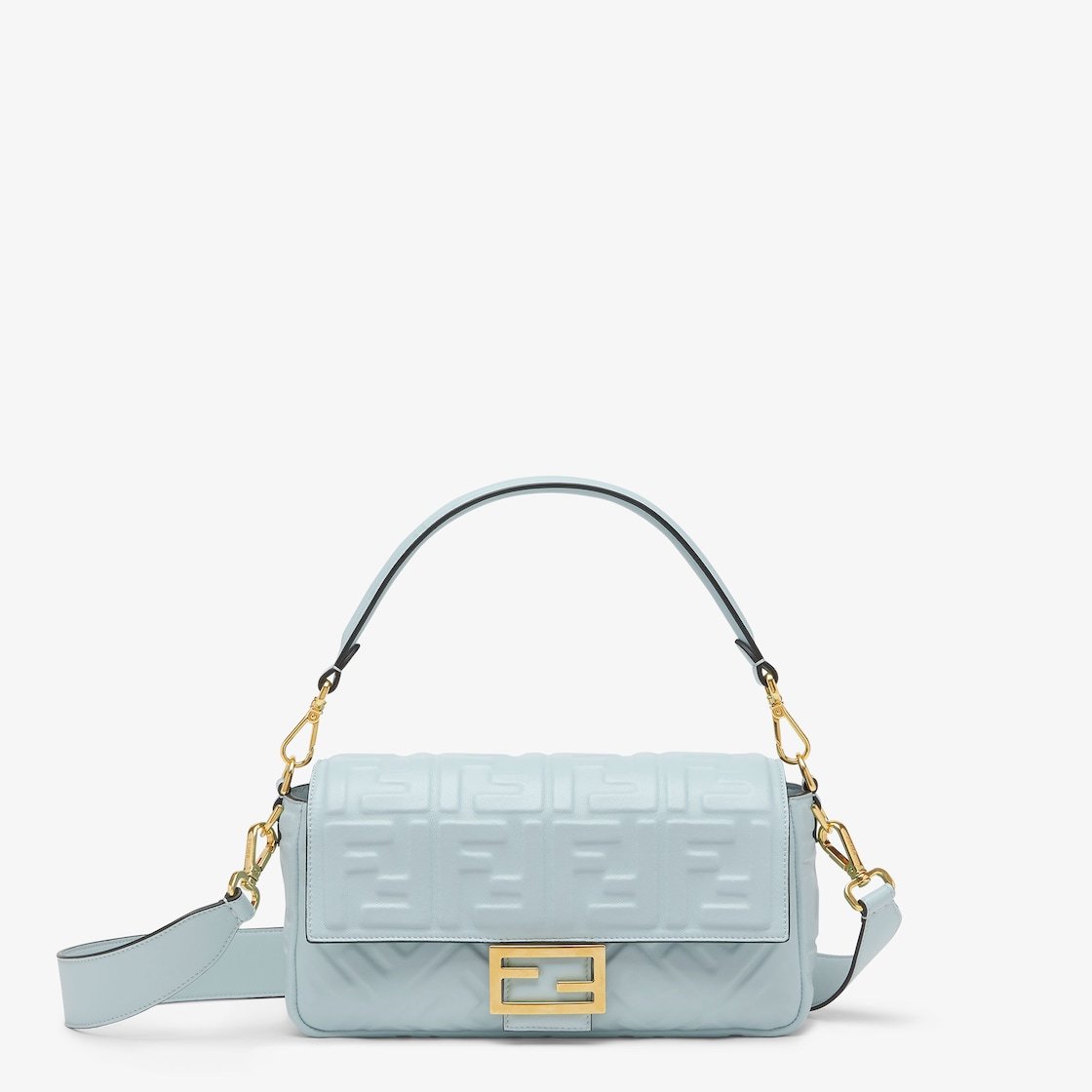 Iconic medium Baguette bag made of soft nappa leather in light blue with a 3D-texture, embossed FF motif. Decorated with an FF clasp.