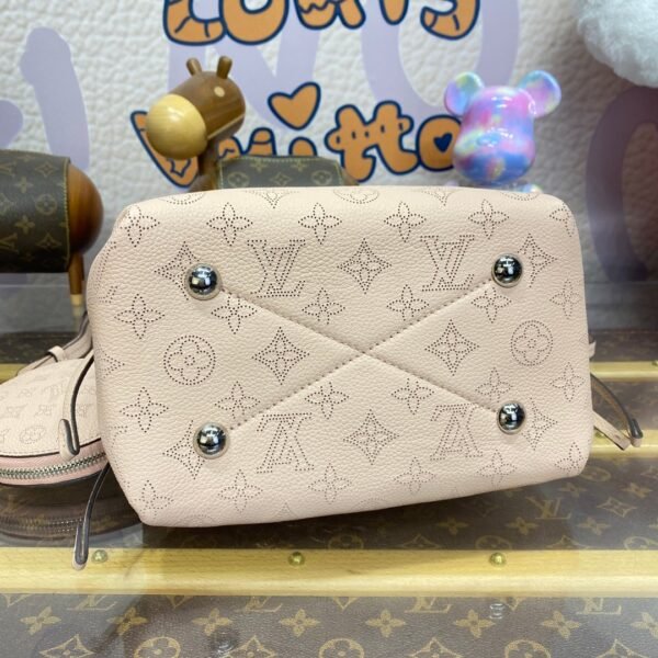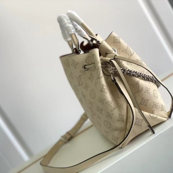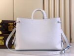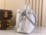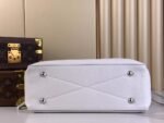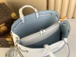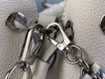 The roomy Bella Tote is made from Mahina perforated calfskin in a vivid white-and-blue colorway as part of the Aura Collection. The LV Circle motif evokes classic House design while the silver-color hardware, including the removable chain, brings a feeling of casual sophistication. The roomy interior has two compartments separated by a zipped pocket.