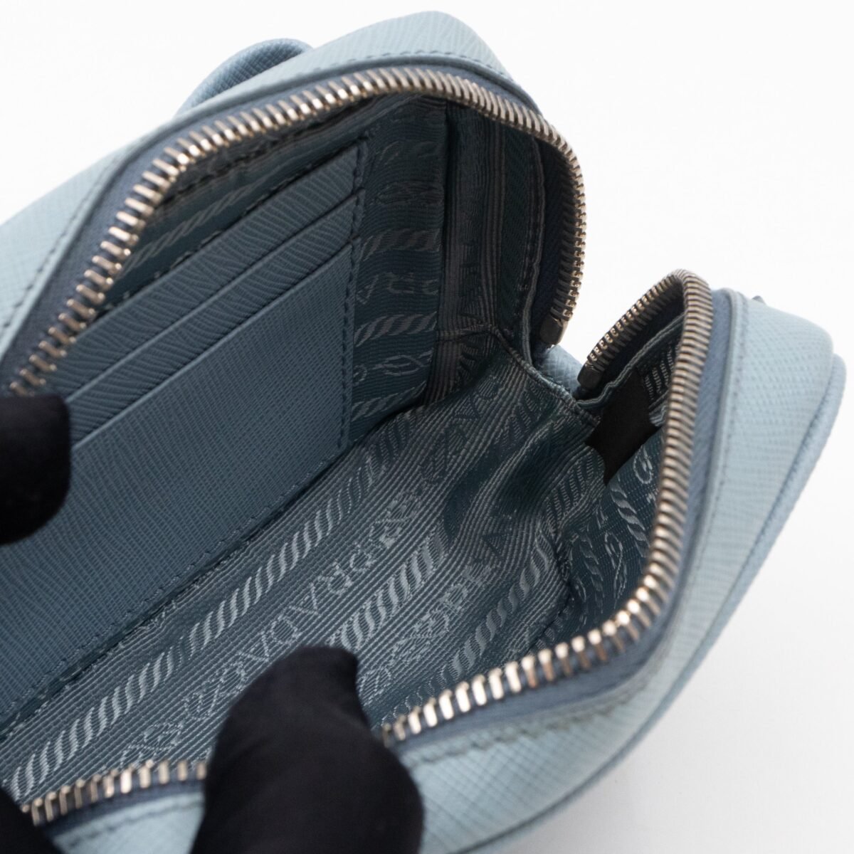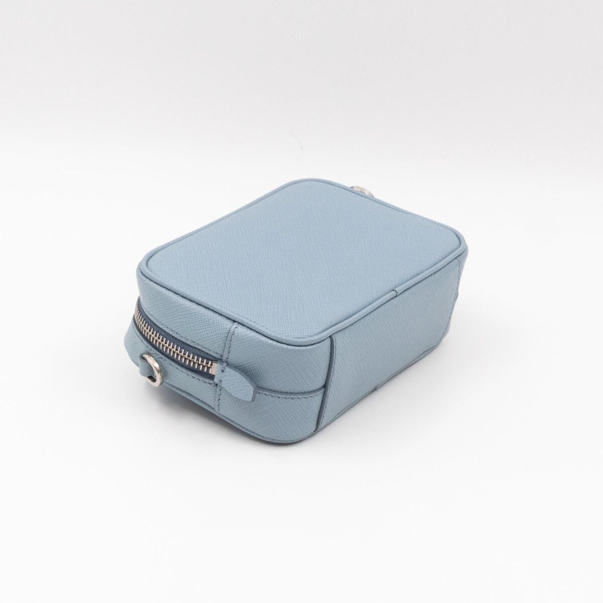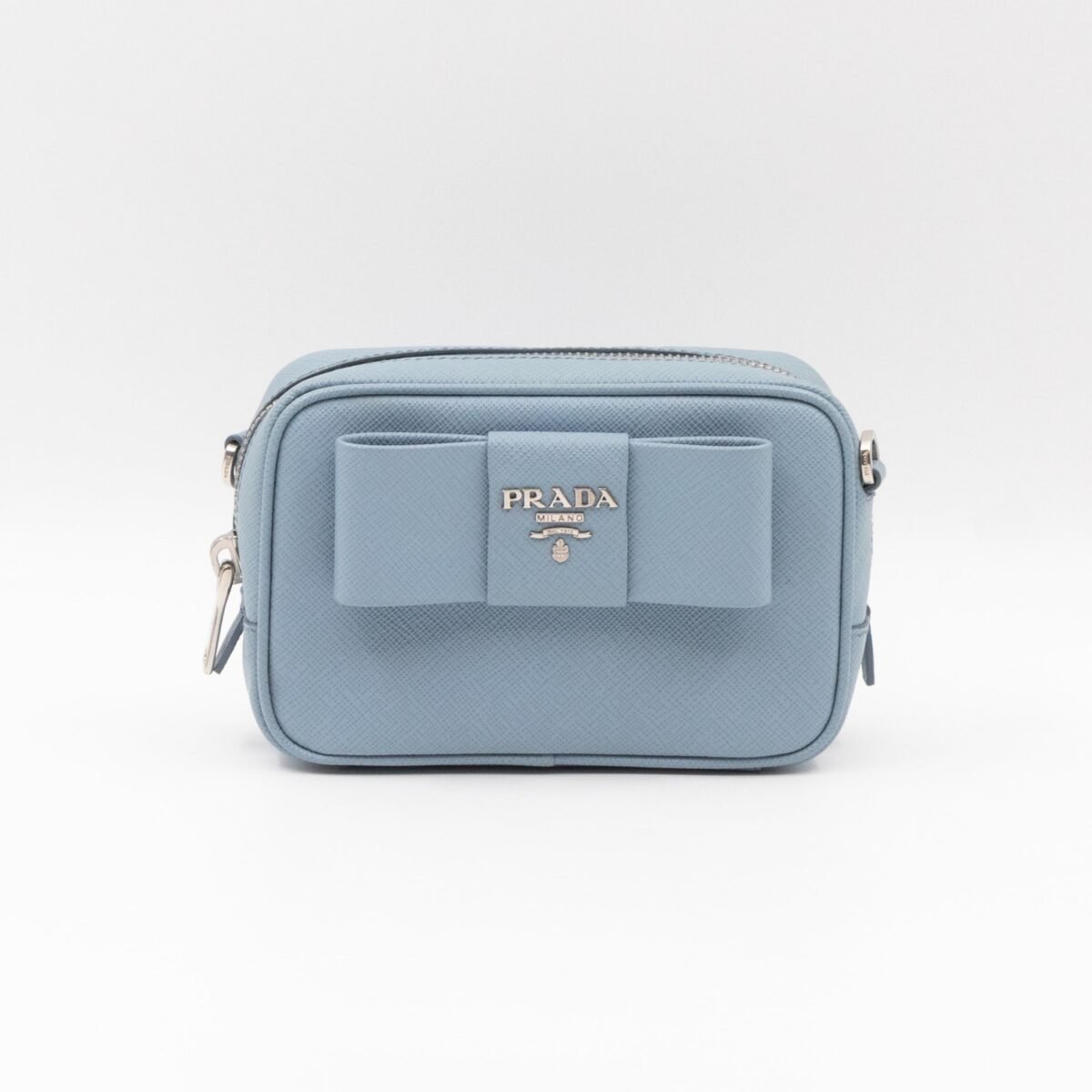 A Prada crossbody camera bag in light blue saffiano leather. This small sized bag has a removable shoulder strap for comfortable crossbody use. Great for daily use for your phone, cards, and keys. Inside has two slim pockets. On front a silver Prada logo on a lovely bow. Inside fits a phone with max length is 14 cm.
