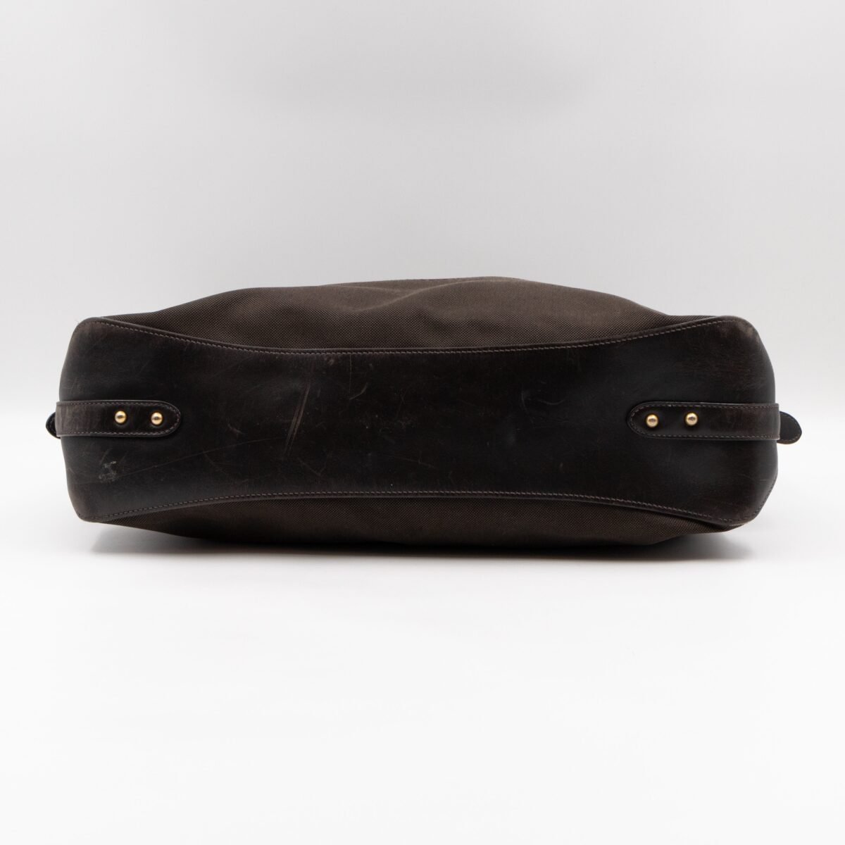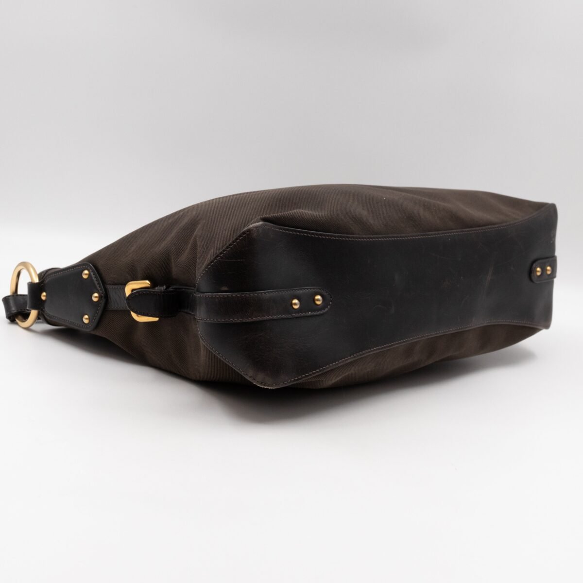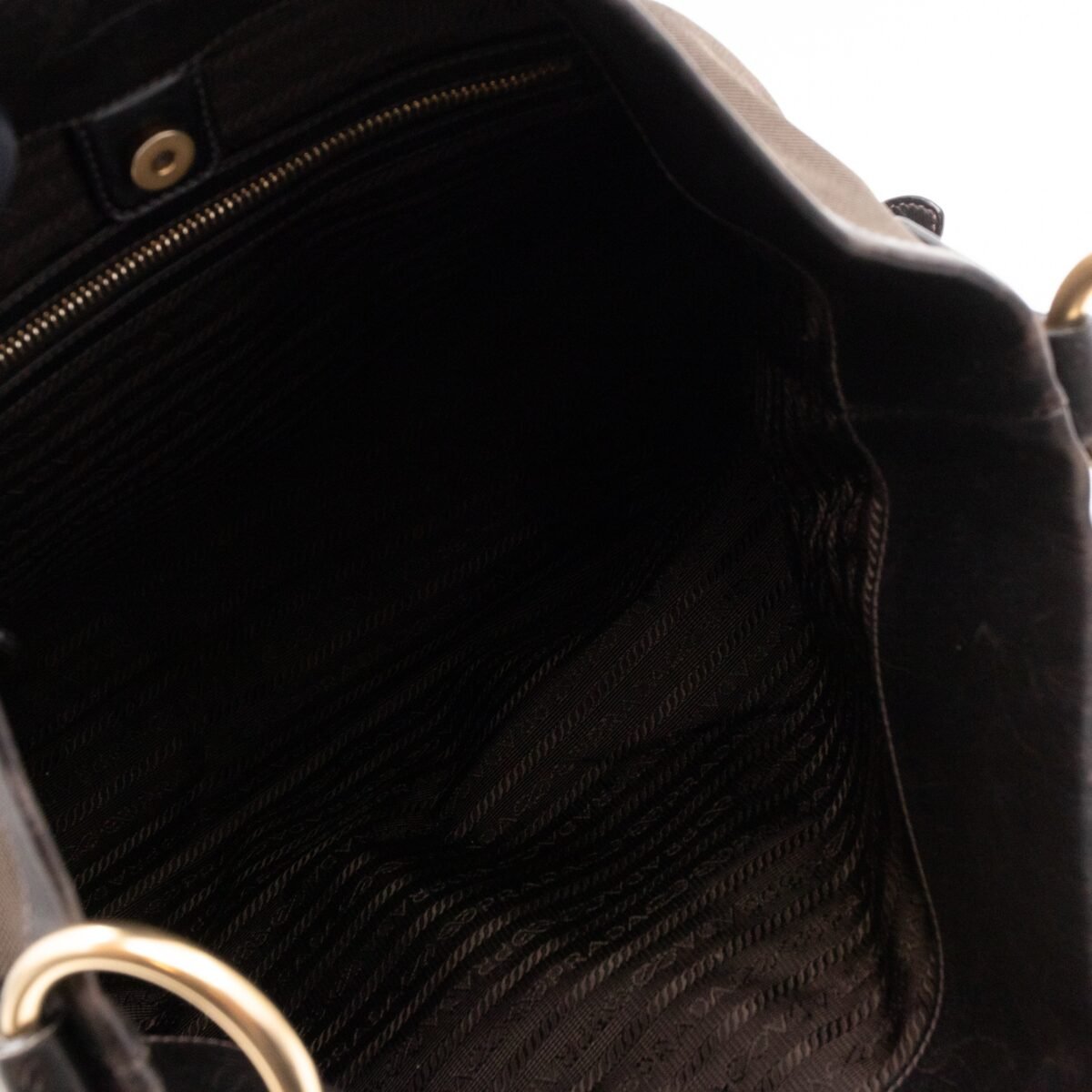 A Prada Canapa Hobo bag in brown canvas. Made in brown canvas and leather with gold-tone hardware. Convenient every day bag, nice size to carry your daily items. Single handle on large rings for comfortable shoulder carrying. Inside is a zipper pocket, the middle has a button closure.