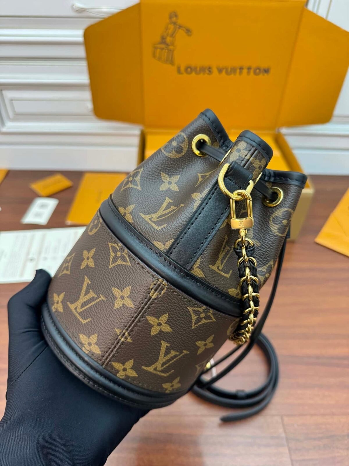 The CanoƩ bucket bag in Monogram canvas is a fusion of two iconic Louis Vuitton models: the historic NoƩ and the fashionable Cannes. With its small proportions, Cannes-inspired molded bottom, and NoƩ drawstring, it perfectly combines style with functionality. The braided chain and leather strap, both detachable, give carry options.
