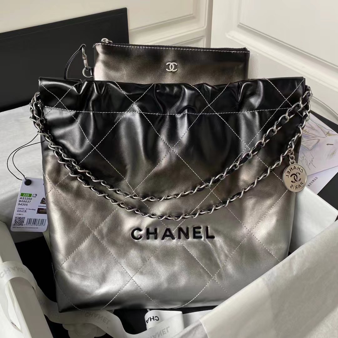 Chanel 22 AS3260 Small Bag Black and Silver Shiny Calfskin Silver Hardware