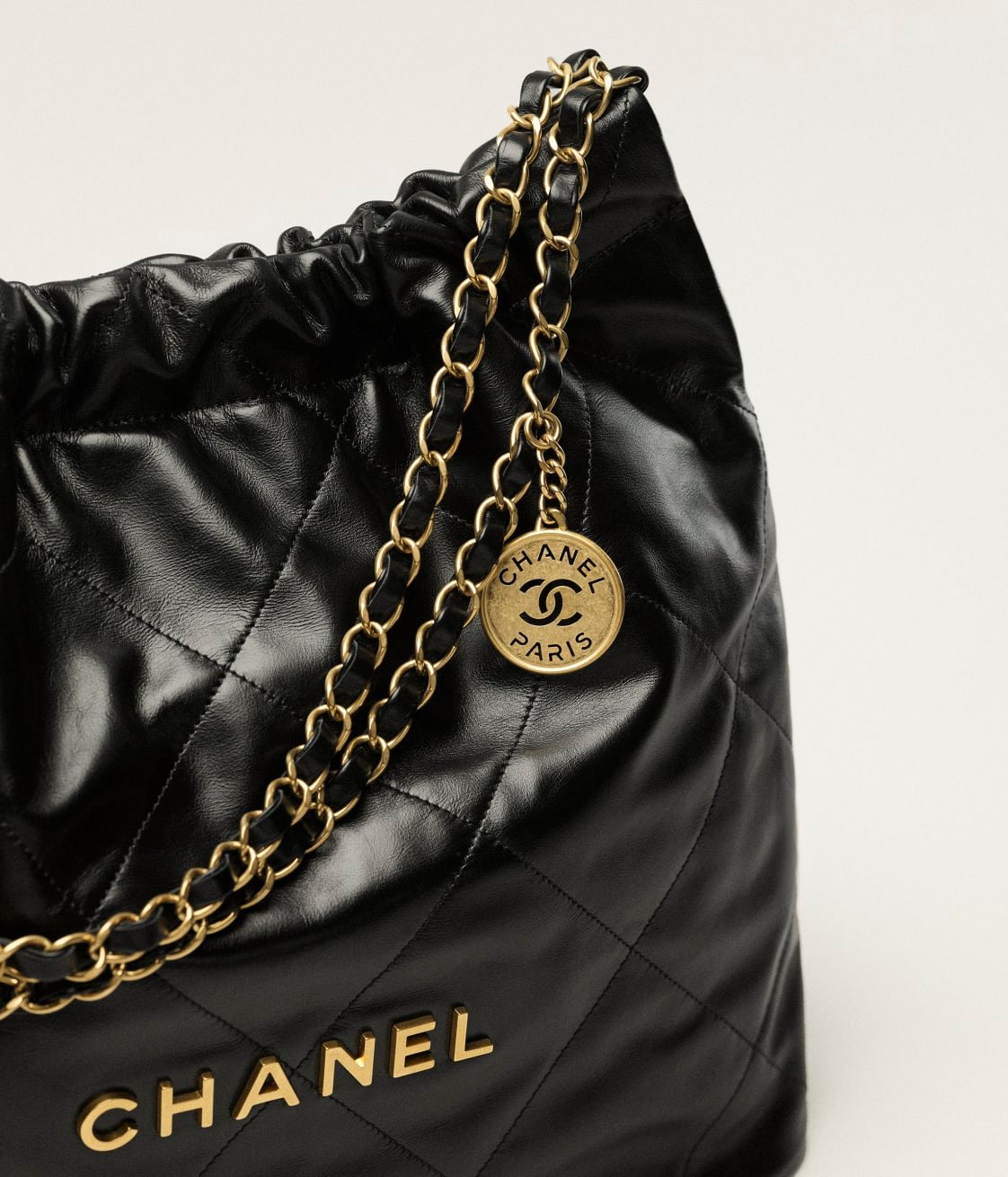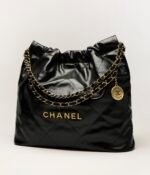 This 22 Hobo Bag is in metallic black calfskin with gold tone hardware, CHANEL on the front in gold tone metal, a short gold tone and leather interwoven chain, a long one, and a long leather cord strap.