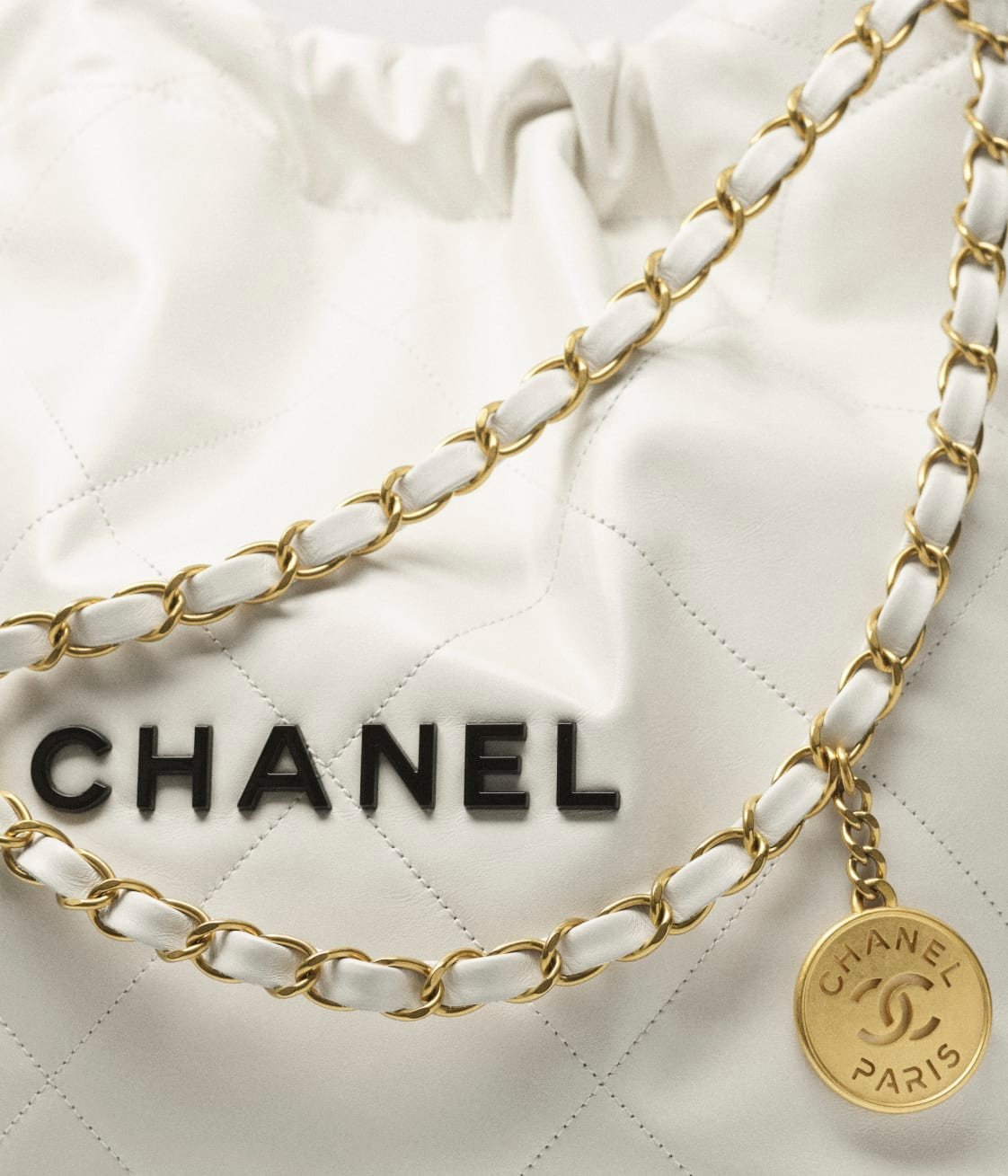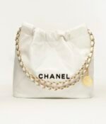 This Small 22 Hobo in white calfskin with gold hardware, black metal CHANEL on the front, gold and leather interlaced short chain, long chain and long leather cord shoulder strap.