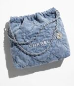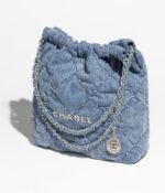This small 22 Hobo bag is made of blue stitched denim with silver hardware, signature diamond quilting and small silver rivets on the front and bag, silver metal “Chanel” logo on the front, Chanel Paris metal hangtag, silver metal interwoven chain links, blue leather shoulder strap and a long leather cord.