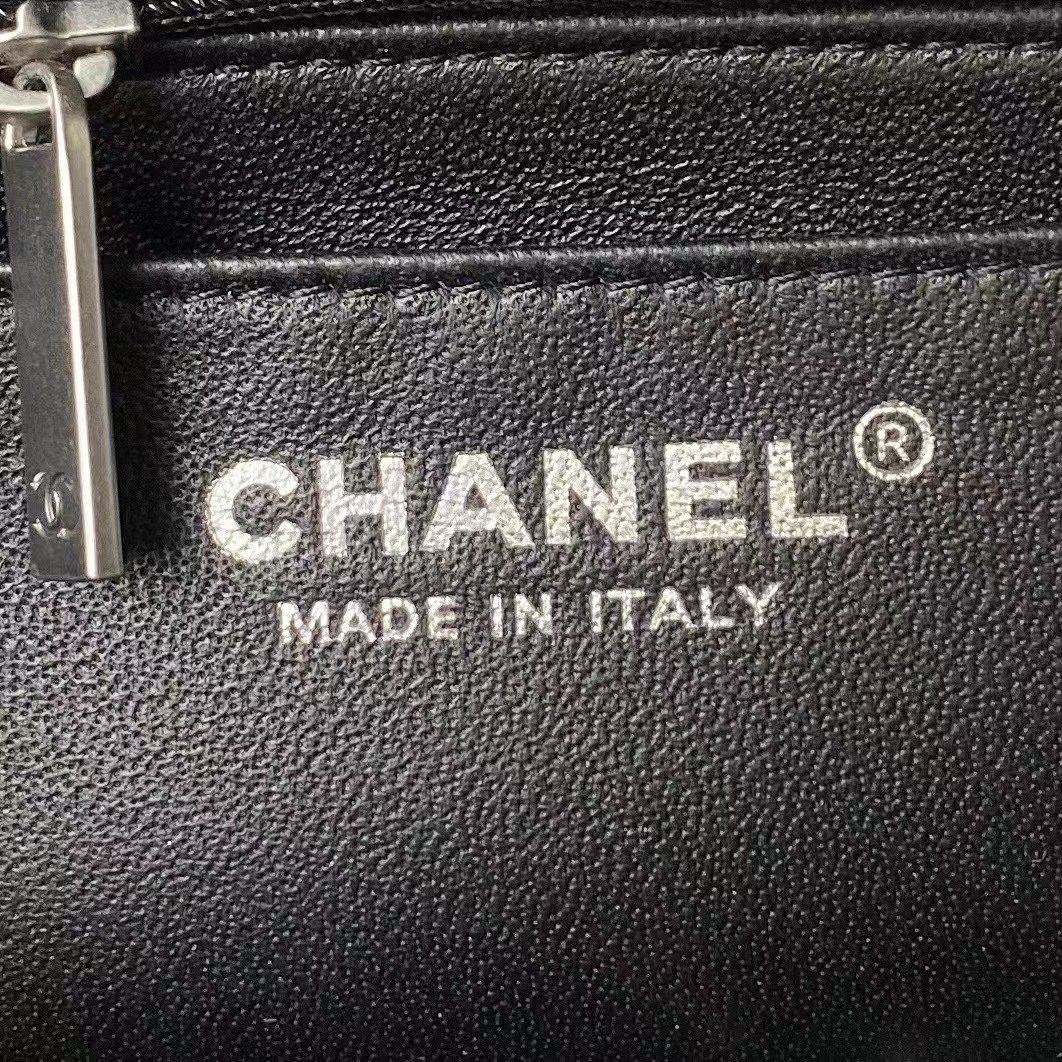 The interior is lined in black leather with a zippered pocket with Chanel zipper and an open pocket underneath.