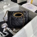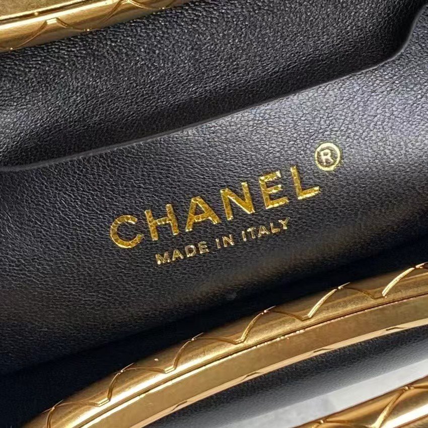 This exquisite Chanel evening bag captivates with its elegant design and luxurious details. The pure black body, reminiscent of a starry night, is both simple and sophisticated. The intricate diamond pattern and iconic gold double-C logo exude understated luxury, while the unique handle adds a touch of charm and playfulness. The classic black and gold combination makes it a perfect accessory for evening events and formal attire.