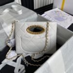 This exquisite Chanel evening bag captivates with its elegant design and luxurious details. The pure black body, reminiscent of a starry night, is both simple and sophisticated. The intricate diamond pattern and iconic gold double-C logo exude understated luxury, while the unique handle adds a touch of charm and playfulness. The classic black and gold combination makes it a perfect accessory for evening events and formal attire.