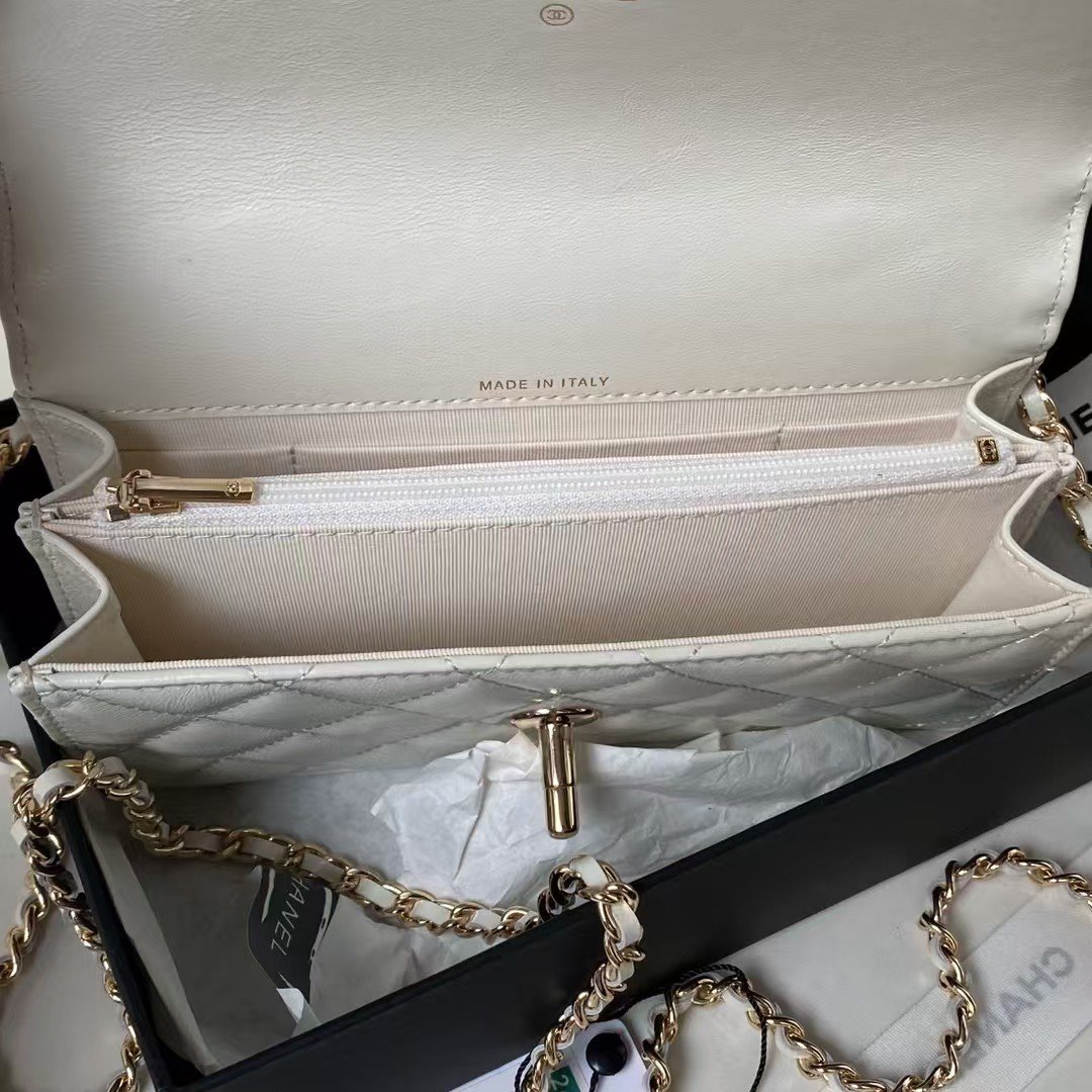 New Chanel 24p Top Handle Woc Pearl Handle Gold Embossed Double C Button Shiny Crinkled Lambskin White
