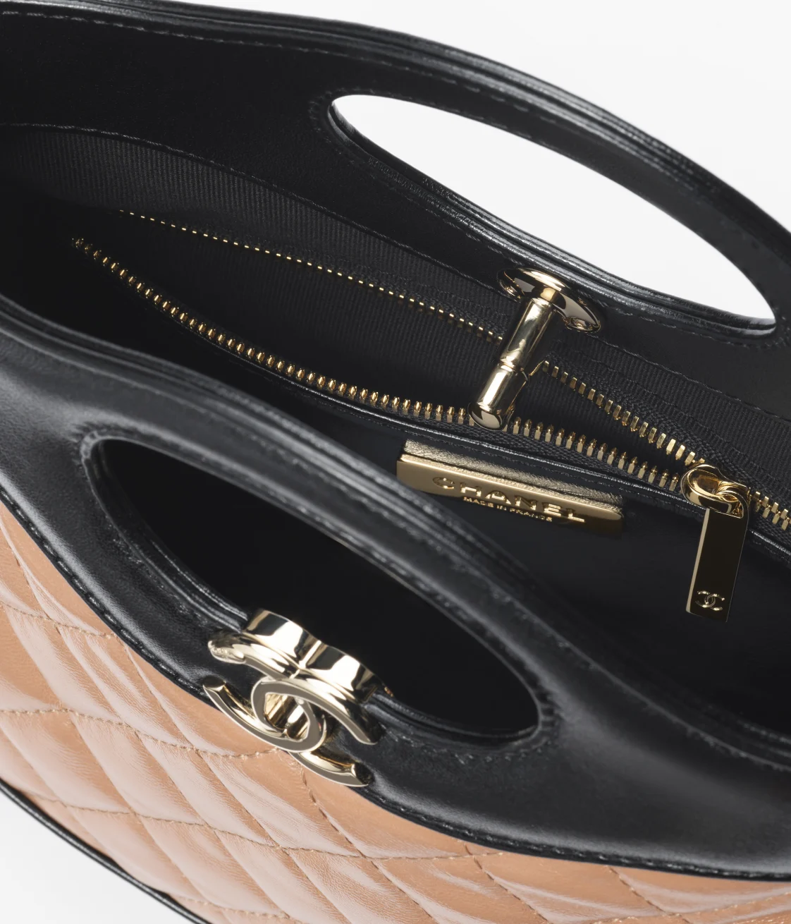 This Chanel 31 micro shopping bag is crafted in dark beige and black shiny lambskin with light gold hardware and features a cutout top handle, CC turnlock closure, an interwoven black leather and light gold chain link shoulder strap, and a black leather rope shoulder strap.