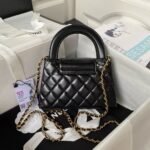 This Mini Kelly is crafted from glossy black calfskin leather with brushed gold hardware, tonal stitching, two flat back top handles, interwoven brushed gold and black leather shoulder straps and the signature CC turnlock closure.