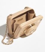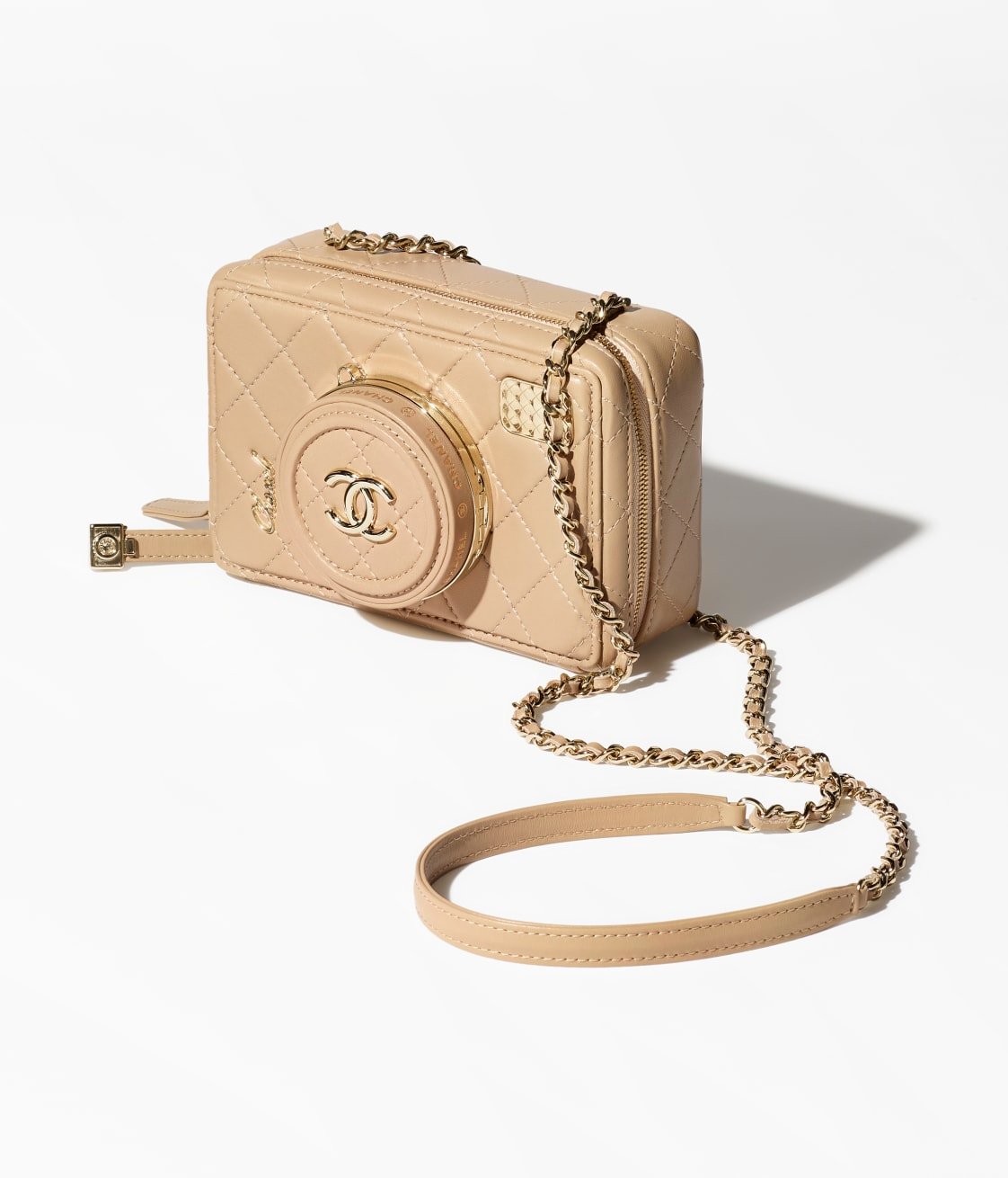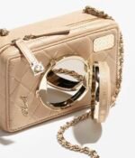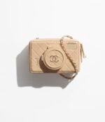 The new camera bag uses diamond quilted sheepskin to create a cute and playful camera shape. The “lens cover” is embellished with the classic double C logo. When opened, it is an exquisite and practical makeup mirror. There are 4 colors to choose from:black, white, dark beige and burgundy, and it comes with a signature leather chain shoulder strap.